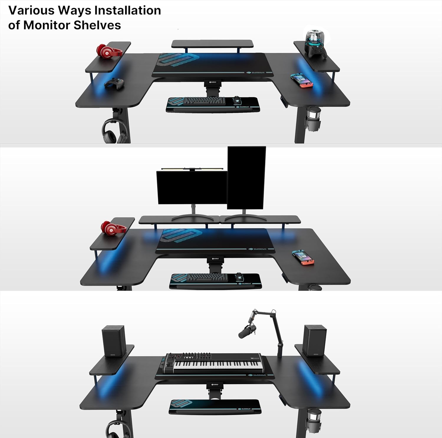 EUREKA ERGONOMIC Standing Desk with Keyboard Tray,U-Shaped 74 Inch Large Gaming Desk,Electric Height Adjustable Music Studio Desk w LED Convertible Shelves