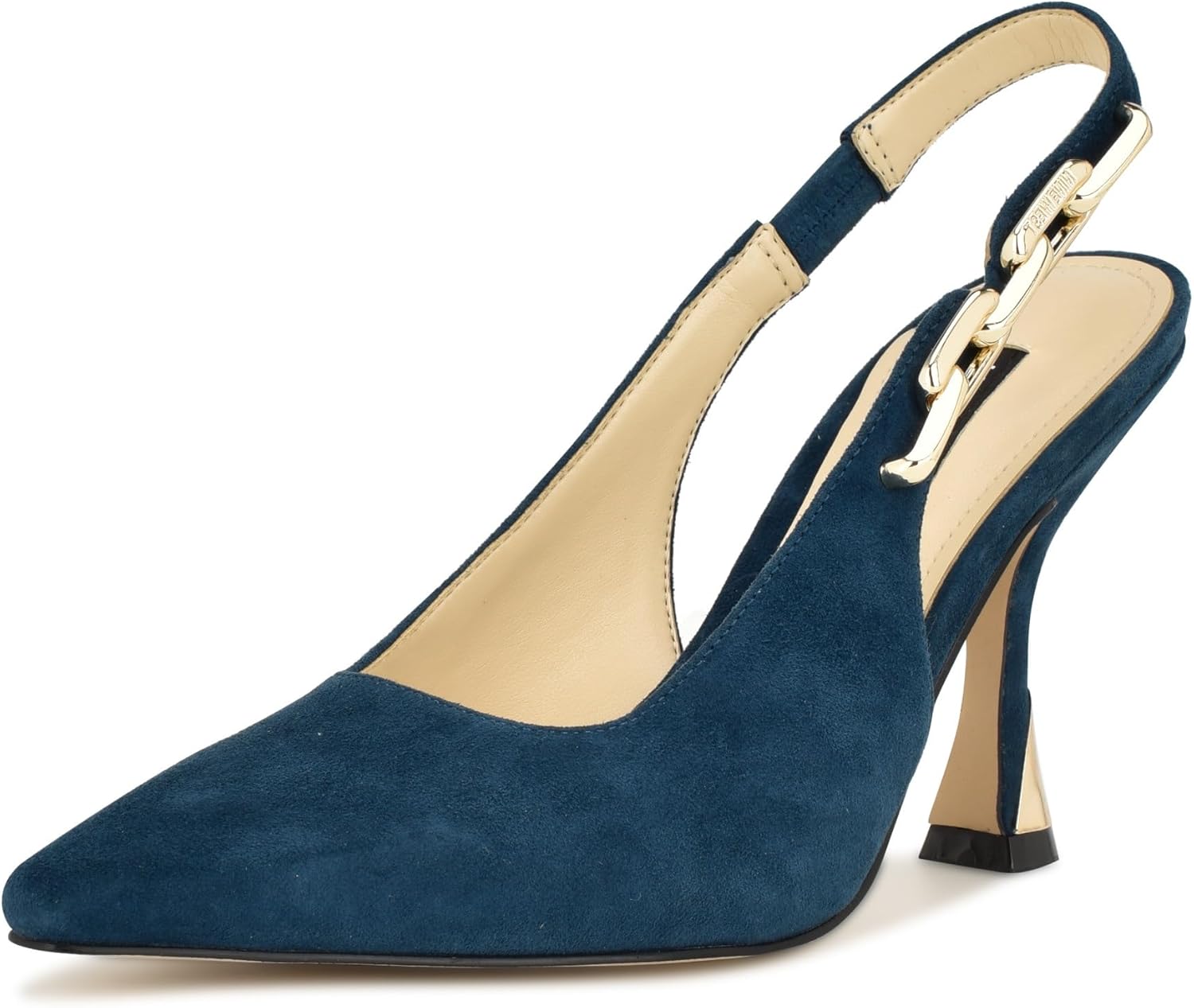Chic and sophisticated, the Nine West Veroni slingbacks are the perfect wardrobe staple! The Veroni features a tapered heel, pointy toe and a slingback strap with gold chain detailing. Founded in 1978, Nine West empowers women to take on the world in style, from day to night.