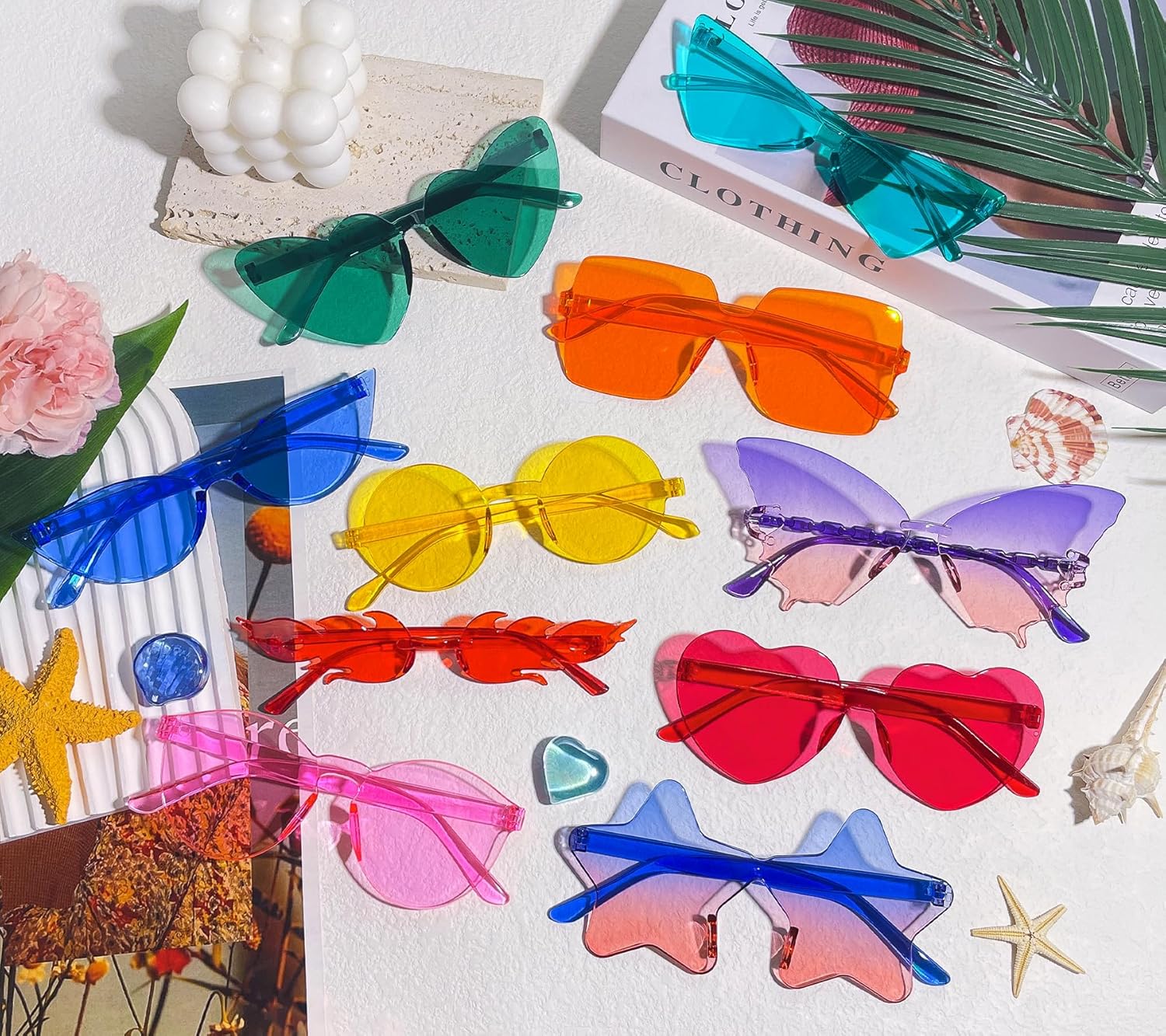 These package include 10 different colored rimless glasses, cat eyes, heart, square, round, fire, sufficient styles and quantities to match your daily needs
