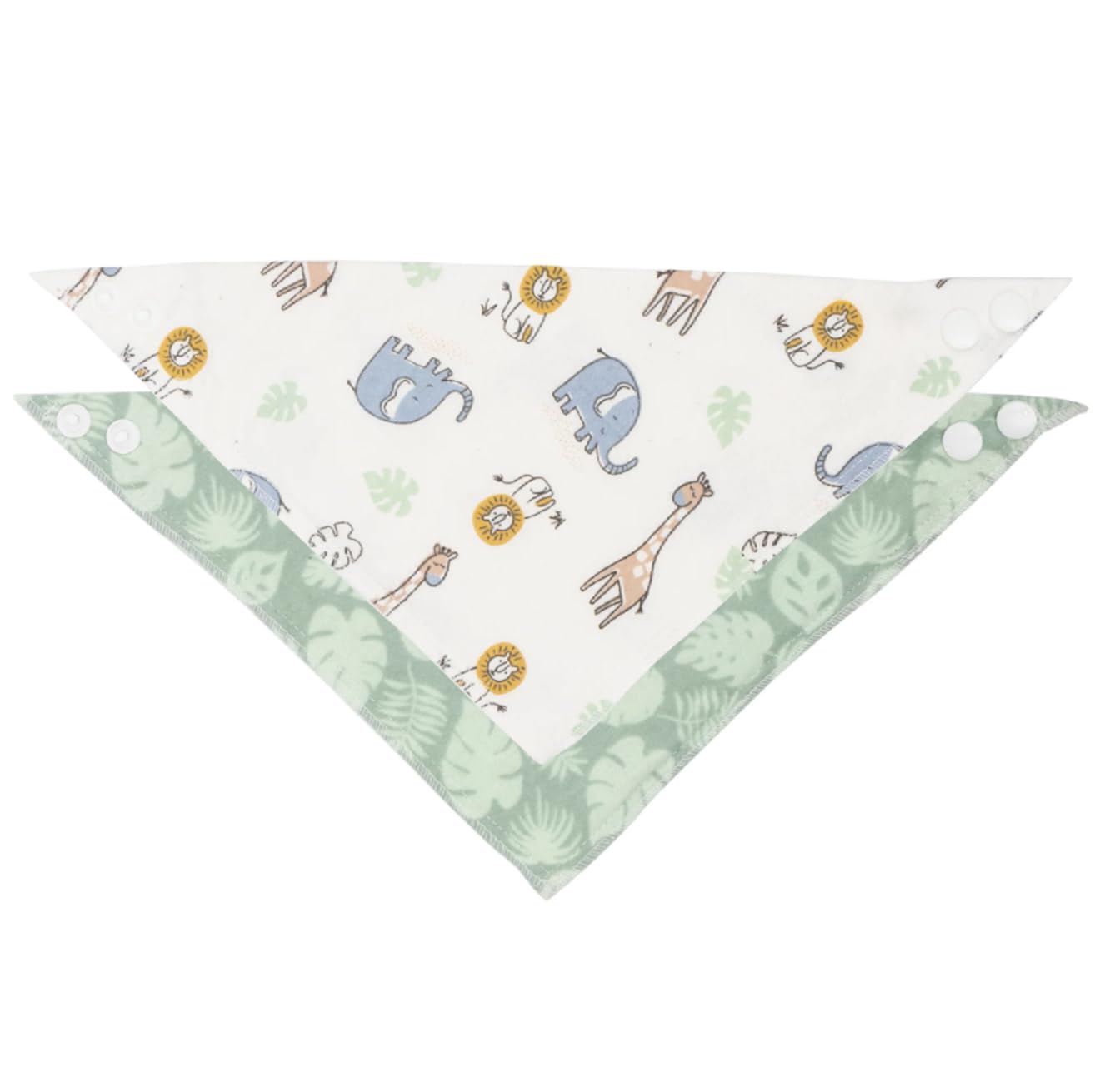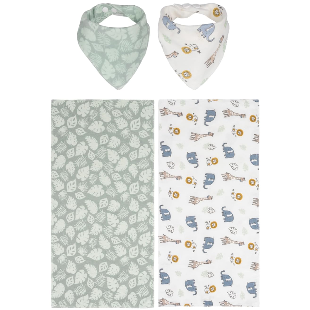 Feeding has never been so stylish with the Tanzania 4 Pack Flannel Bib & Burp Cloth Set from Trend Lab! Keep messes to a minimum with these absorbent, multi-use 100% brushed cotton flannel bibs & burps; perfect for feeding and drooling. Bibs measure 15 in x 7.5 in and have double snap closure in the back allowing them to hang like an adorable bandana on your little one. The burp cloths are 2-layered and generously oversized measuring 10.5 in x 20 in to protect your clothes. Additional colors, prints and flannel products from Trend Lab are sold separately. Patterns include: - Tropical leaves in a sage green palette - Safari animals and leaf illustrated print in a combination of sage green, blue, gold, beige and bedtime gray