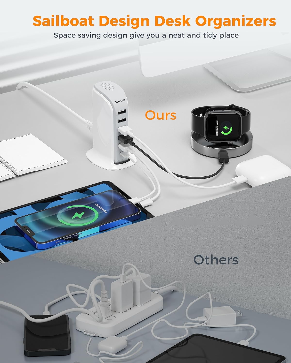 Organizadores de escritorio con diseño de velero para tabletas, auriculares, etc.: diseño de velero con orificios de refrigeración en la parte superior para disipar el calor extremo y ahorrar espacio; simplemente conecte esta estación de carga USB múltiple para organizar su escritorio, mesita de noche, escritorio de oficina, dormitorio o cualquier lugar con un enchufe limitado, lo que le brinda un lugar limpio y ordenado