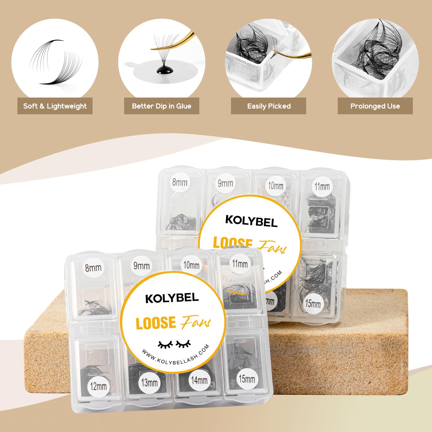 COST EFFECTIVENESS:Kolybel Premade loose fans 600 fans/ box, 8-15mm Mixed Length. premade fans eyelash extensions mixed tray are more affordable and durable. Meet your needs in length, curl and thickness, and help you save money and time on choosing eyelash extensions.