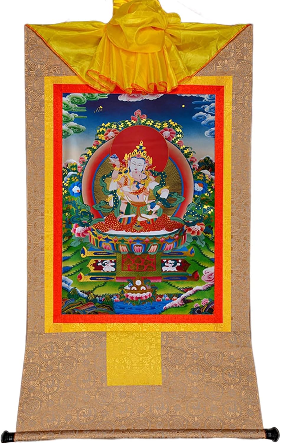 Details:Material: cloth, silk, gold threadEmbroidery: brocade embroideryThe front is covered with silk to protect ThangkaWith exquisite painting shaft and lanyardSize & WeightSmall:20cm(top) *27 cm(bottom) * 35cm(Height)(about 8" * 10.6" * 13.8")Medium:37cm(top) *47 cm(bottom) * 61cm(Height)(about 14.6" * 18.5" * 24")You will receive:1 * ThangkaNote:1.Please allow 1-2cm error due to manual measurement. Please make sure you do not mind before you bid.2.The color may have different as the difference display, Please understand.