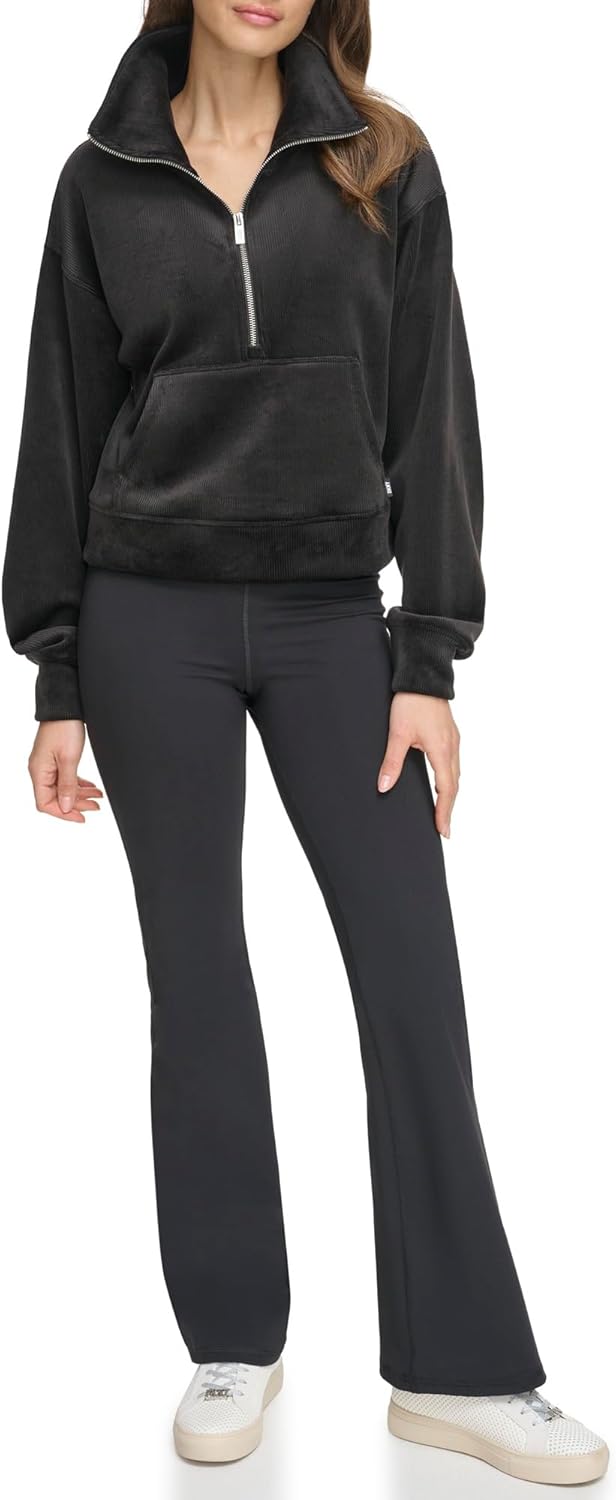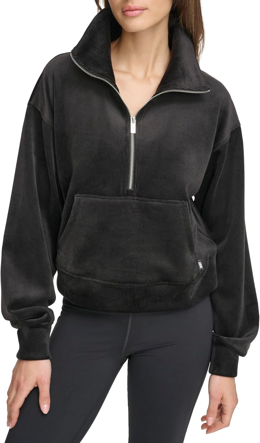 This DKNY Women's Performance Top is a tech velour rib half zip long sleeve pullover kanga pocket