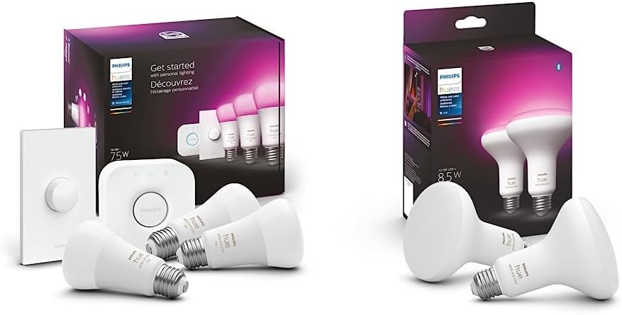 Philips Hue White and Color Ambiance Medium Lumen (75W) Smart Button Starter Kit, Hub Included, 16 Millions Colors, Works with Amazon Alexa, Google Assistant, Apple HomeKit (New Version)This Philips Hue White and color ambiance 75W A19 starter kit has everything you need. Get the ambiance you want with three 75W A19 Hue smart bulbs, one Hue Bridge, and one Hue Smart Button. Getting started is simple. Simply screw in the bulbs, download the Hue app, connect your Bridge and start enjoying the convenience of smart lighting immediately. The Bridge is the heart of the Hue smart lighting system and unlocks the full power of Philips Hue, including the ability to control up to 50 lights and accessories, control multiple rooms and zones, set custom automations, and have smart control from anywhere in the world. The Bridge has a stable and secure connection that remembers your settings, even if the power goes out, and won't put a strain on your Wi-Fi. It's a premium experience that only Philips Hue can offer. It's easy to transform your home decor and the way you feel with millions of shades of warm-to-cool white and color changing light. They can dim, brighten, and set the mood for any moment from birthday celebrations to morning meditation. It's easy to have the right light for routines throughout the day with Hue light scenes. Or create the ultimate mood lighting with dynamic light effects that show subtle changes in color or brightness that you can customize in the app. Enjoy convenient control for everyone in your home. The Hue Smart Button makes it easy to change turn lights on or off or change the settings with just a tap. Perfect for guests, kids, or anyone who may not have the app handy. Looking for smart bulbs that work with Alexa and Google Assistant? It's easy to set up voice control with the Hue app and use simple voice commands to control your lights. Whether you need smart LED lights for bedrooms, your living room, or even kids rooms, Hue complements your room decor while offering the convenience of smart control.Philips Hue White & Color Ambiance BR30 LED Smart Bulbs, 16 Million Colors (Hue Hub Required), Compatible with Alexa, Google Assistant, and Apple HomeKit, New Version, 2 Bulbs (578096)Philips Hue White and Color Ambiance BR30 LED Smart Bulbs (Bluetooth Compatible), Works with Amazon Alexa, Google Assistant, and Apple HomeKit