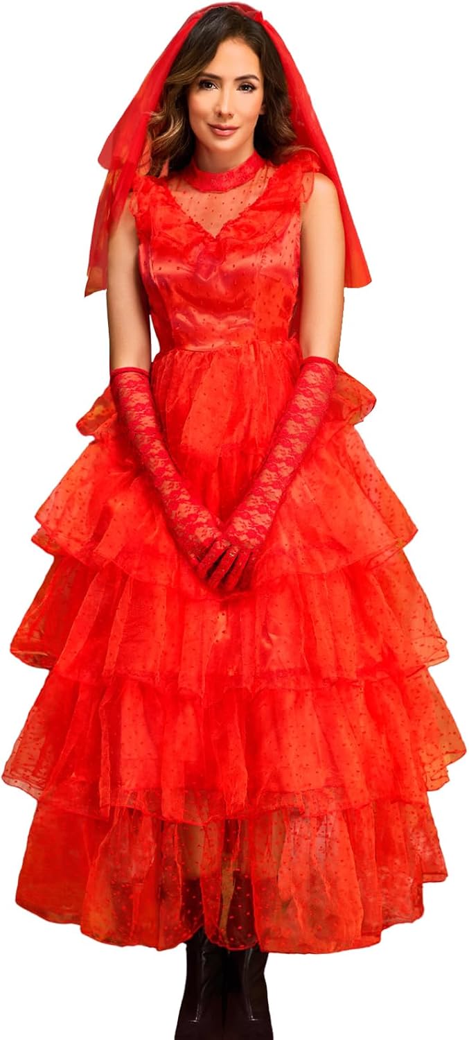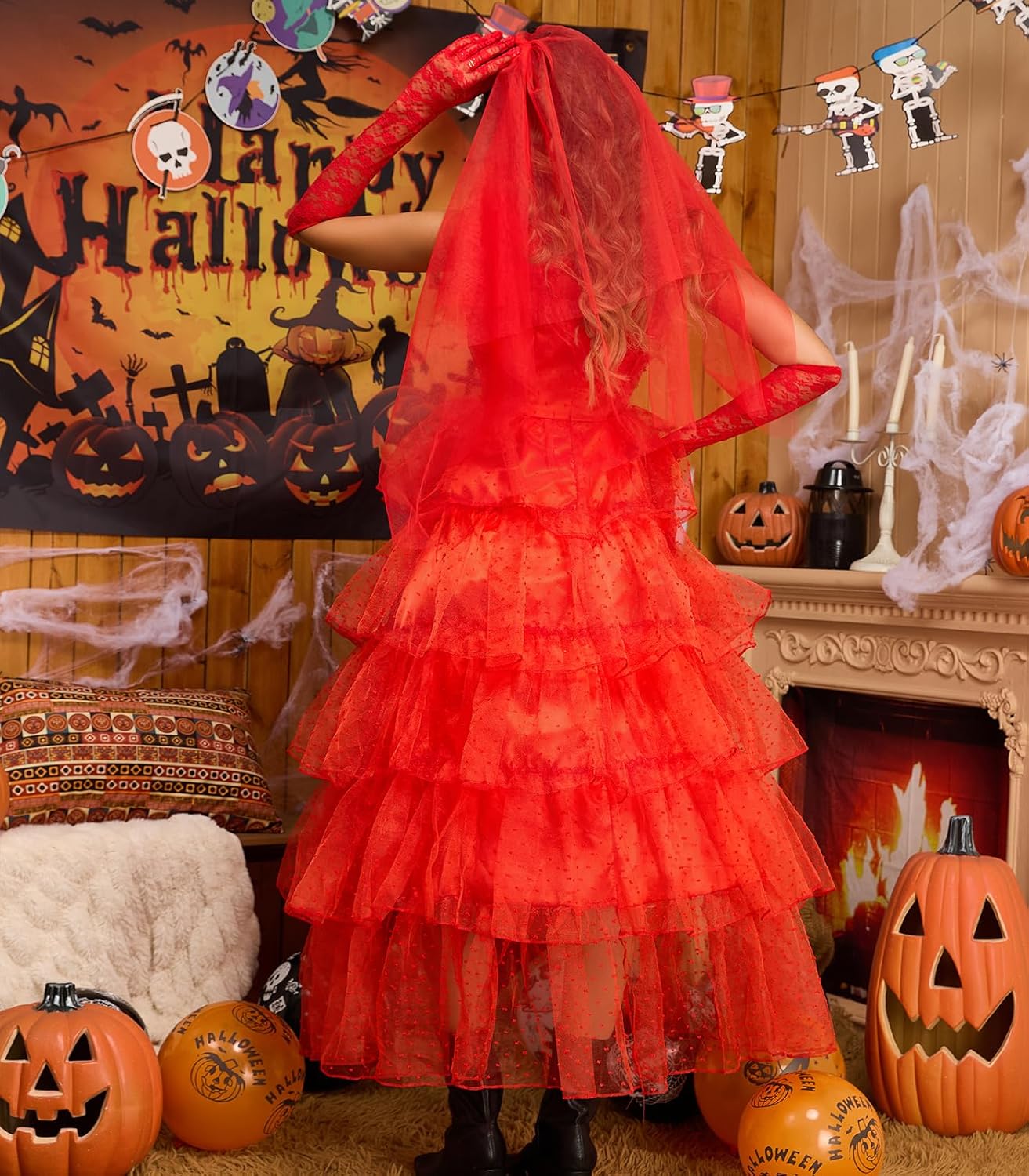 Lydia Deetz Costume Red Wedding Dress 80s Prom Tulle Dress For Women Dead Bride Halloween Gothic Costumes XL