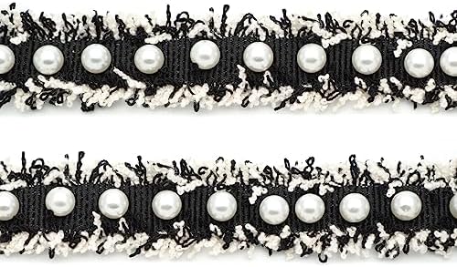 CRAFTMEMORE Pearl Bead Lace Edge Trim Ribbon Faux Pearl on Tweed Fabric Trimmings Embroidered Applique DIY Sewing Craft H892 (2 Yards)
