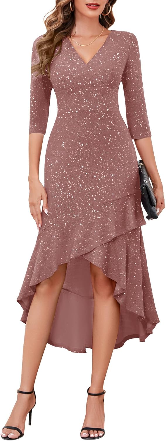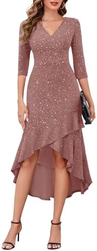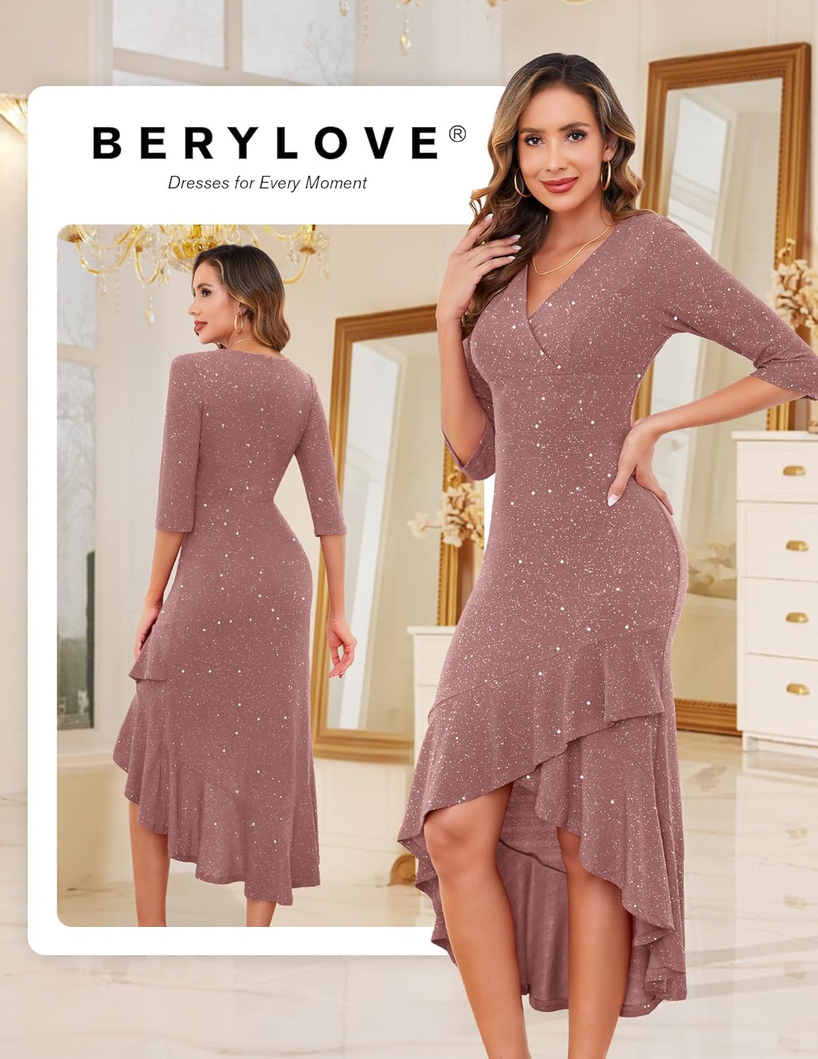 BeryLove Women Sequin Formal Cocktail Glitter Dress 3/4 Sleeve Evening Gown Party Homecoming Wedding Ruffle Hi Low Dresses