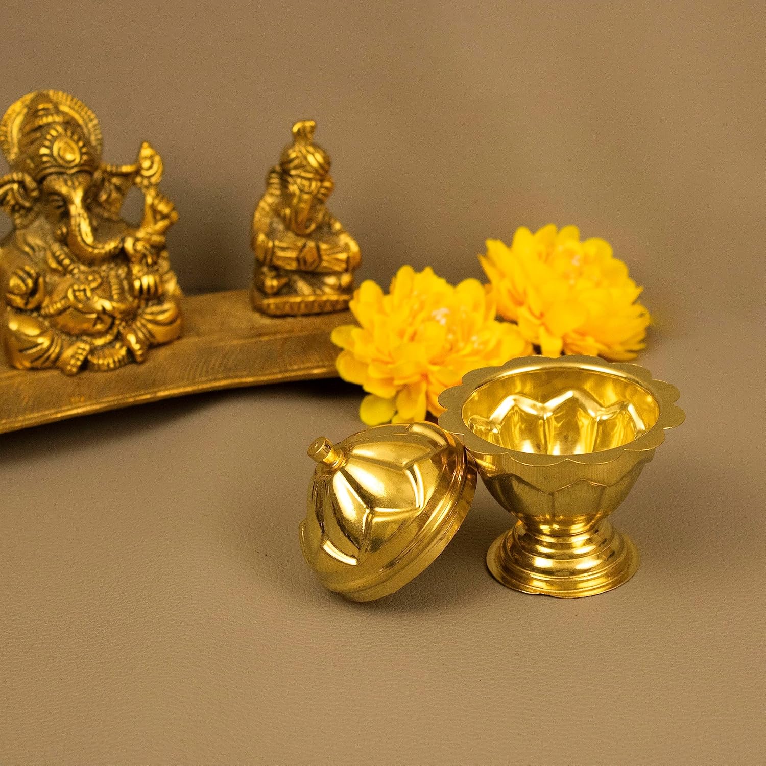 Brass Box Pooja | Puja | Roli | Chawal | Chandan | Haldi | Kumkum Puja Box | Sindoor | Turmeric | Dabbi | Dibbi | Dhani | Dani Lid Holder - Cup Kumkum