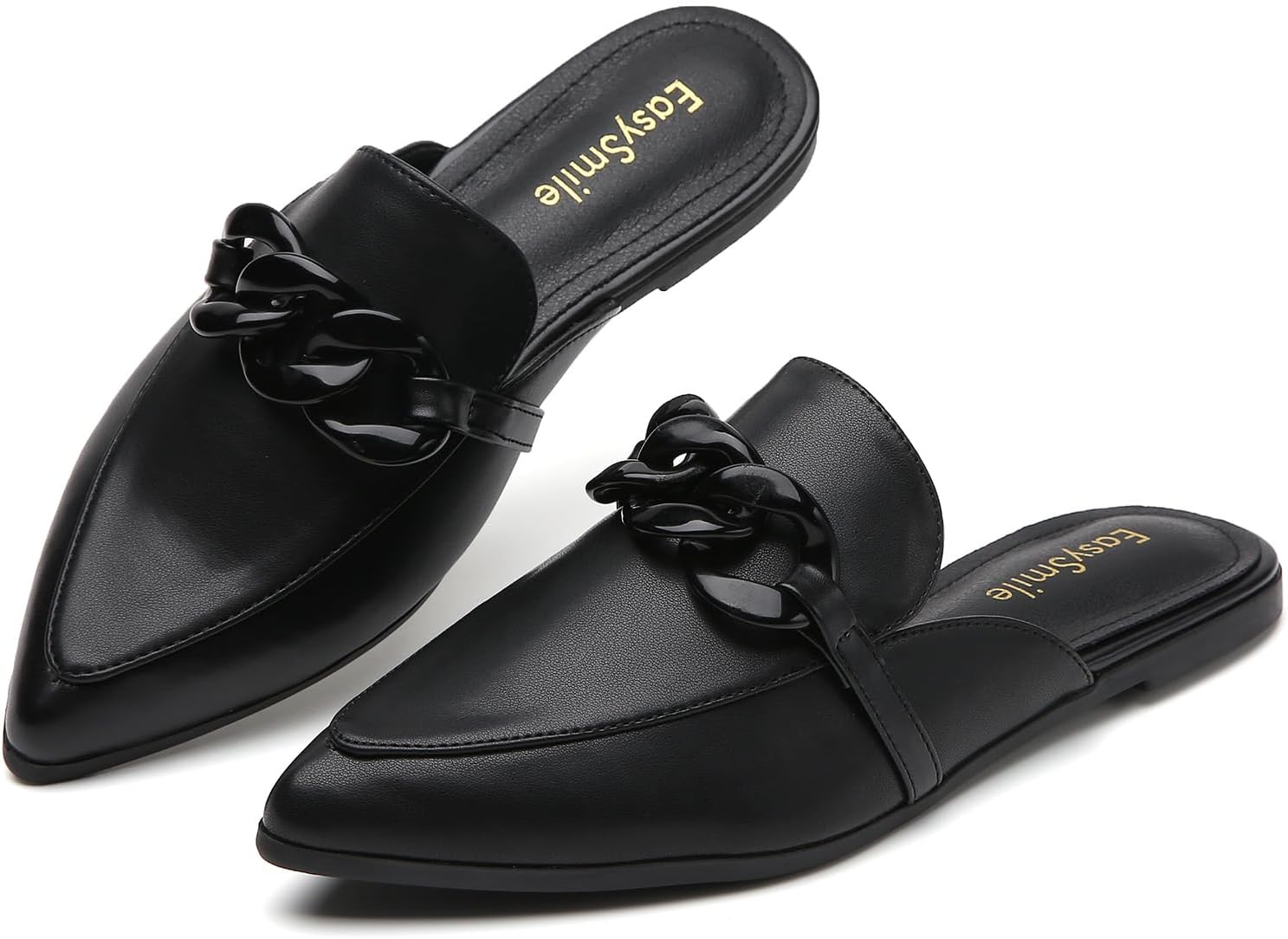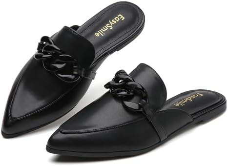 Metal Chain Decor Flat Mules for Women Closed Pointed Toe Slip on Loafers Slides Backless Mules Shoes