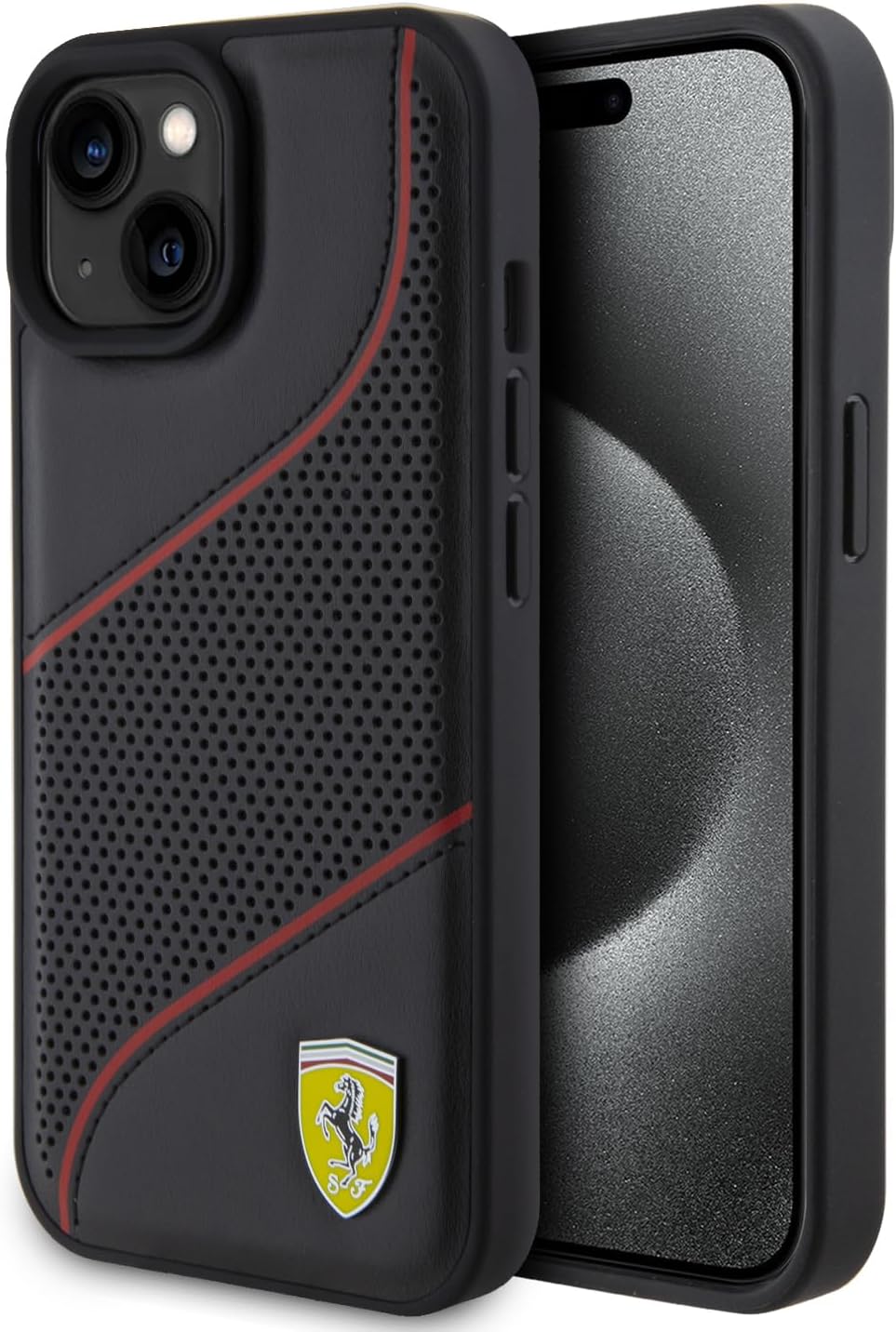 CG MOBILE Ferrari Designed for iPhone 15, Ultimate Protection & Cool PU Leather in Black Slanted Perforation Durable Hard Phone Case