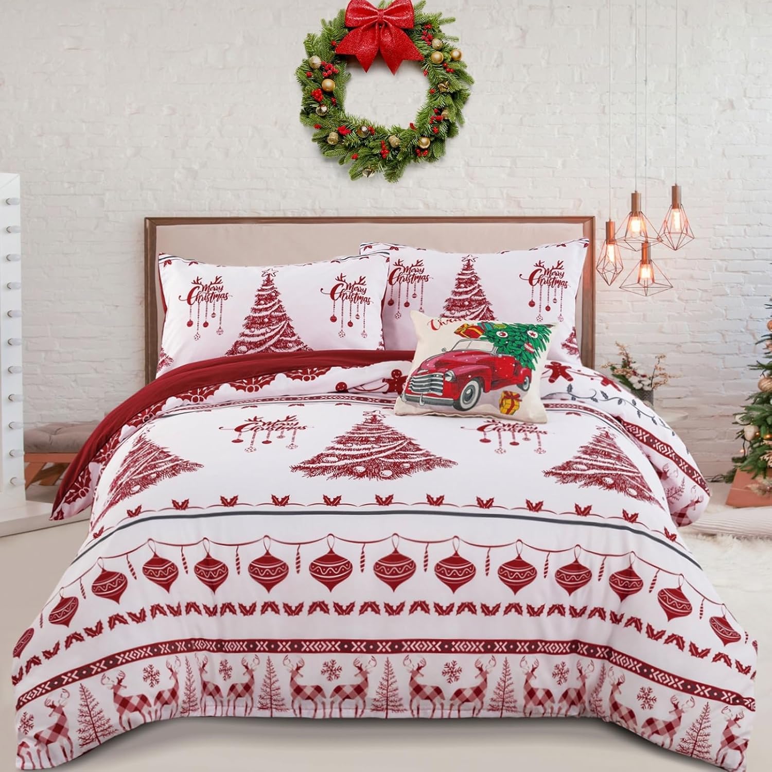 Luxudecor Christmas Duvet Cover Set Queen Size 3 Pieces Red Yuletide Duvet Cover Christmas Tree Winter Pattern Bedding Set Comforter Cover for New Year (90"x90")