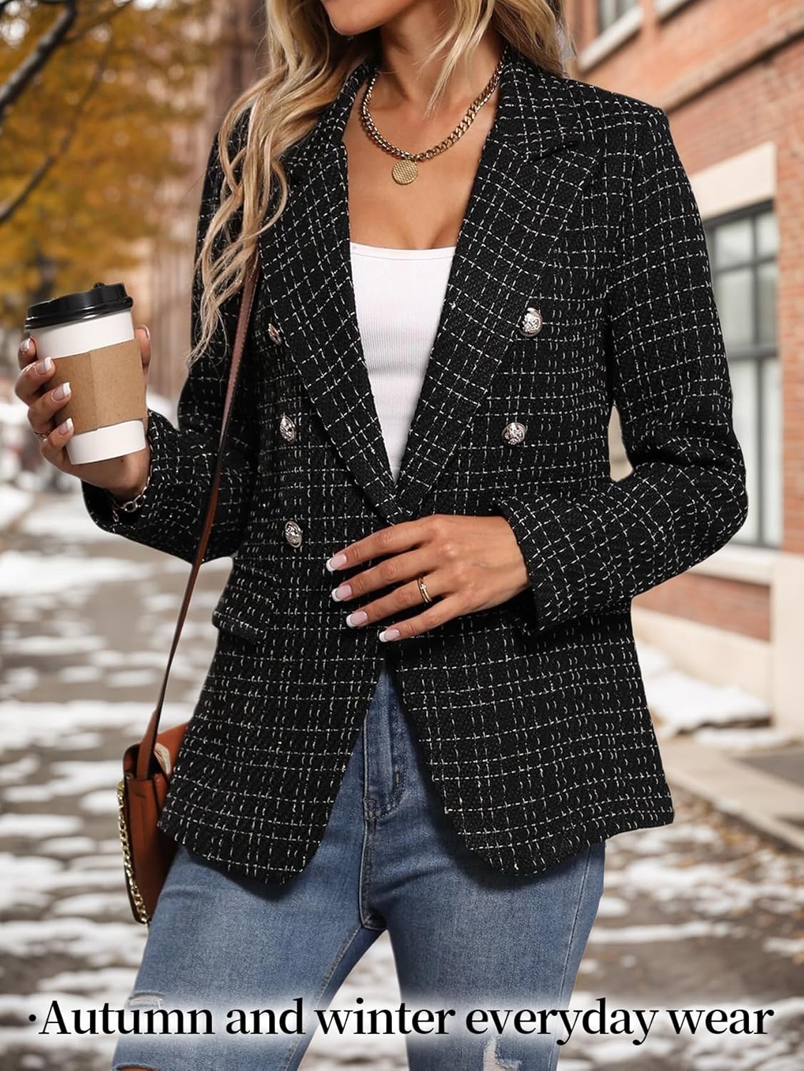 Mina Self 2025 Fall Women's Tweed Plaid Blazer Jacket - Fully Lined Fashion Business Casual Lapel Elegant Coat with Pockets