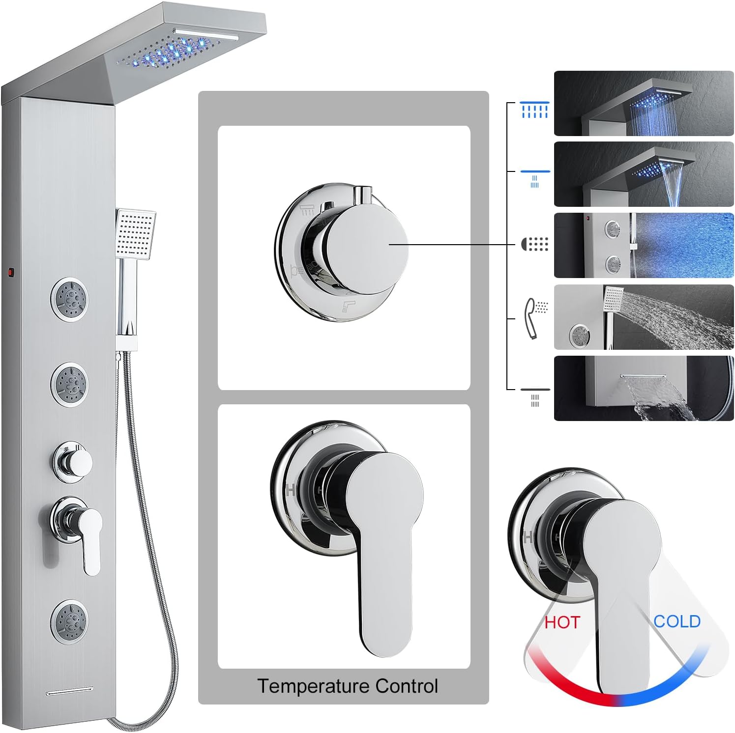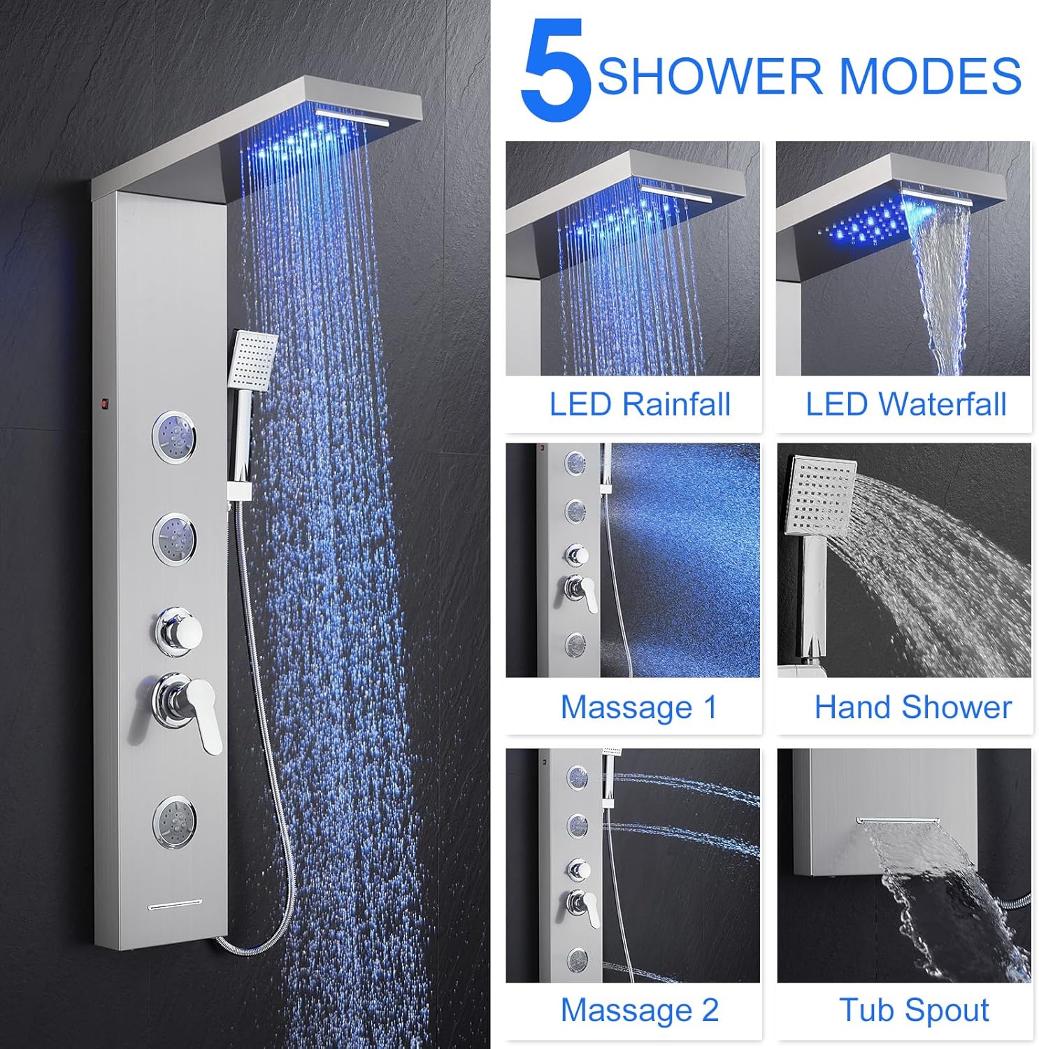 5 in 1 Shower Panel Tower System with LED Lights, Rainfall and Waterfall Shower Head, 3 Pcs Adjustable Body Jets, Handheld Shower, Tub Spout (Brushed Nickel)