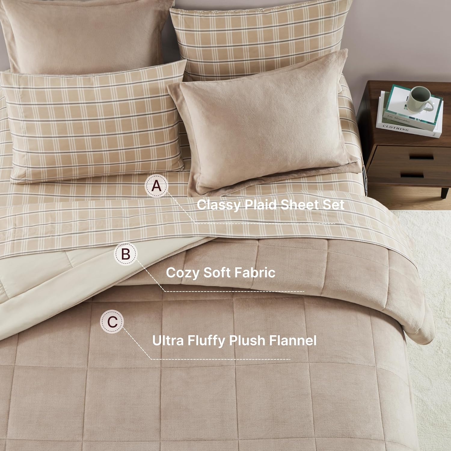 Classic Design: Our plush queen comforter set is made of one side with warm plush flannel and the other side with soft and breathable year-round polyester fabric. The plaid design of the printed sheet set adds a taste of classy. The queen size comforter's box stitching design prevents shifting and clumping of the filling for maximum durability and luxury. NOTE: THE PLUSH FLANNEL IS IN MICROPLUSH.