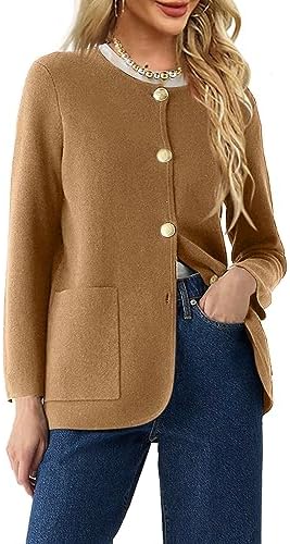 Langwyqu Womens Crew Neck Button Down Cardigan Sweaters Blazer Casual Long Sleeve Knit Solid Sweater with Pockets