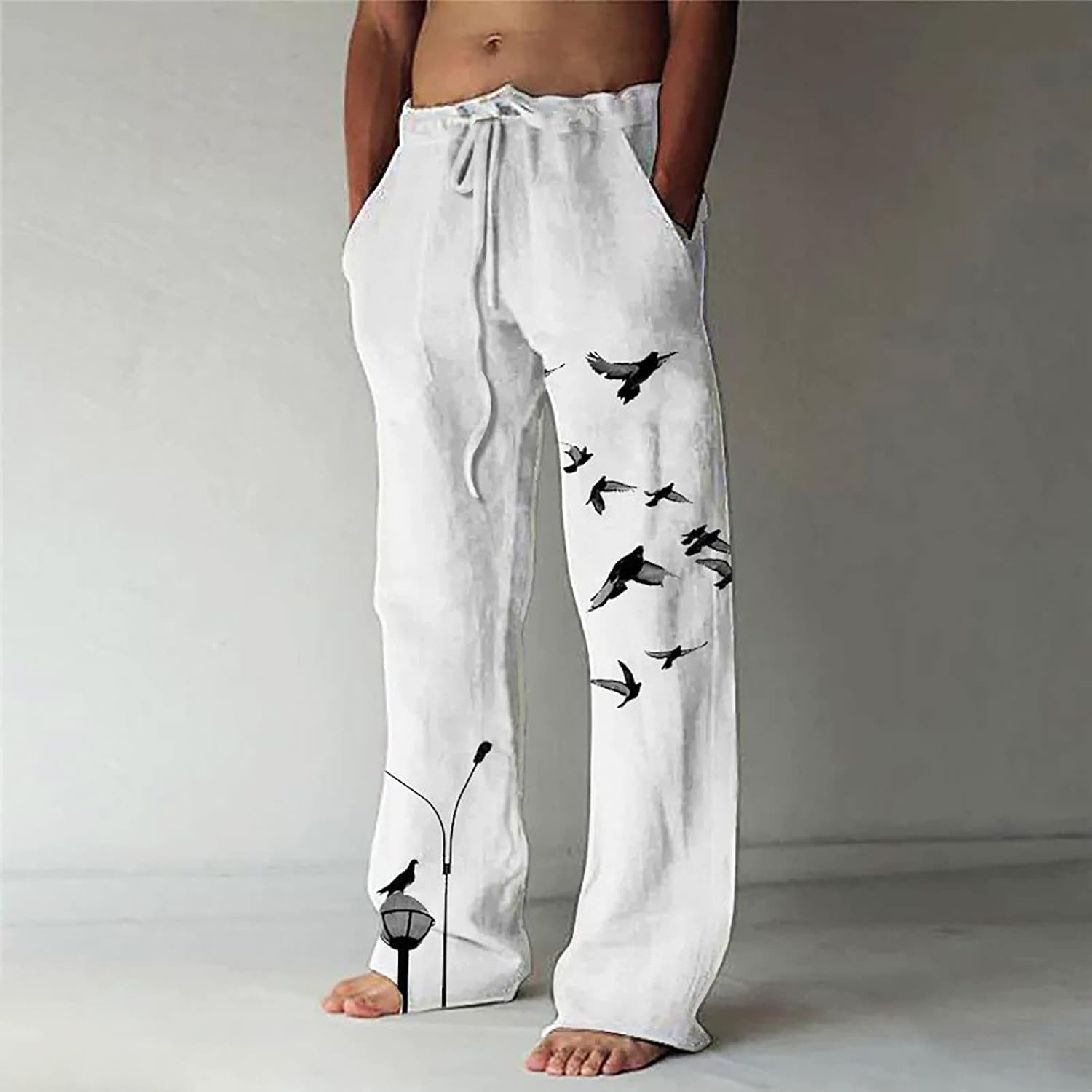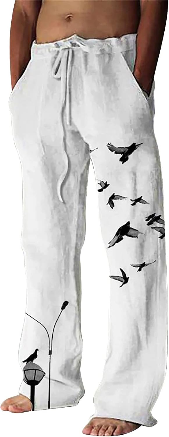 Pantalones holgados de lino para hombre, holgados, ligeros, de pierna ancha, transpirables, transpirables, cintura elástica, estampados