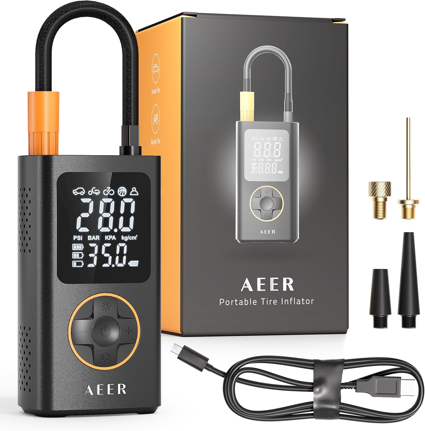 𝐈𝐍𝐍𝐎𝐕𝐀𝐓𝐈𝐕𝐄 𝐃𝐄𝐒𝐈𝐆𝐍 𝐖𝐈𝐓𝐇 𝐋𝐄𝐃 𝐋𝐈𝐆𝐇𝐓𝐈𝐍𝐆: Our car air pump features a bright backlight LCD display and long-lasting LED lights, allowing easy use at night or in low-light conditions. Not many air compressors & inflators offers both functionality and sleek aesthetics like ours does.
