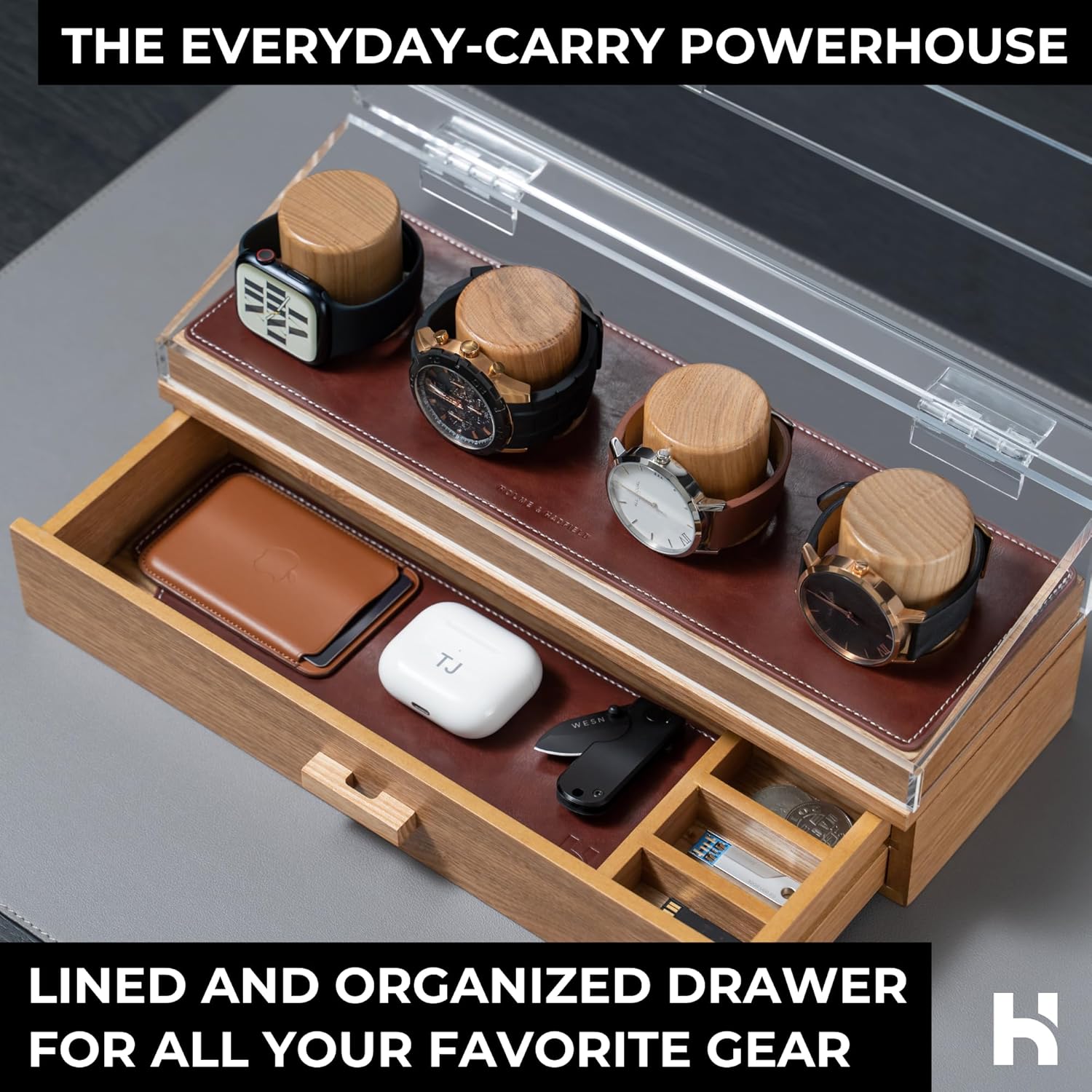 PLENTY OF ROOM FOR EXTRAS — The Watch Deck Pro has everyday carry covered with an added accessory drawer. Use the slots for pocket knives or watch straps with room leftover for your wallet, earbuds, wedding band, or glasses.