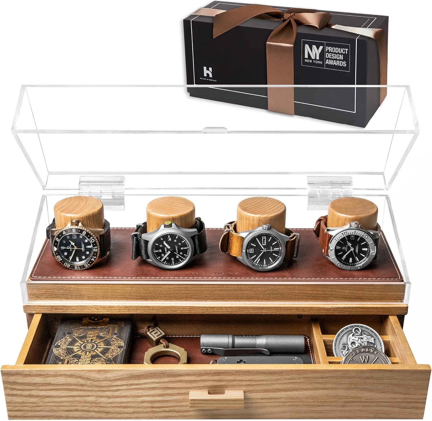 Holme & Hadfield Premium 4-Slot Wooden Watch Display Case – Handcrafted Men’s Watch Box with Accessory Drawer, Hinged Cover, Leather Lining – Birthday Gift for Collectors – Luxury Built to Last