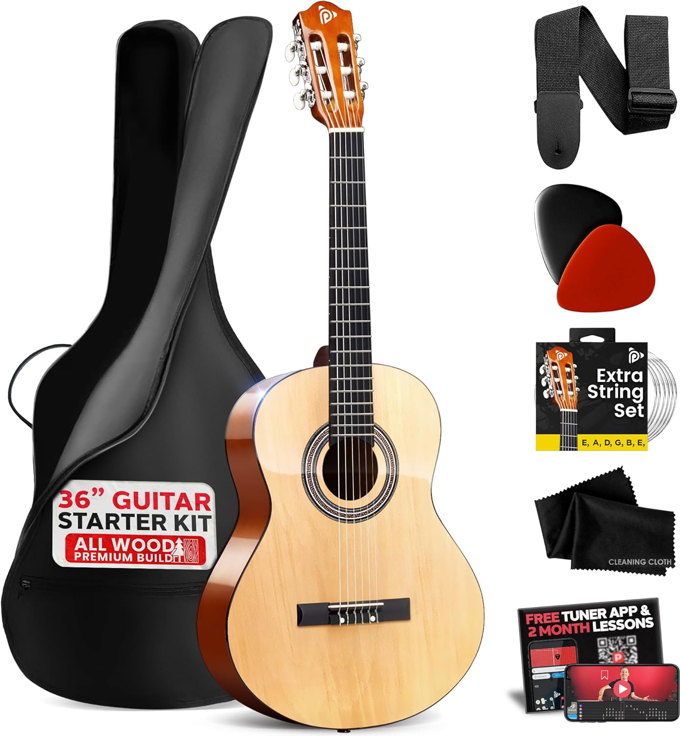 Pyle Beginner Acoustic Guitar Kit, 3/4 Junior Size All Wood Instrument with Full Accessory Kit, Picks, Shoulder Strap, Carry Case, Cleaning Cloth, Tuner App, 2 Month Lessons, 36” (Ash Gloss)