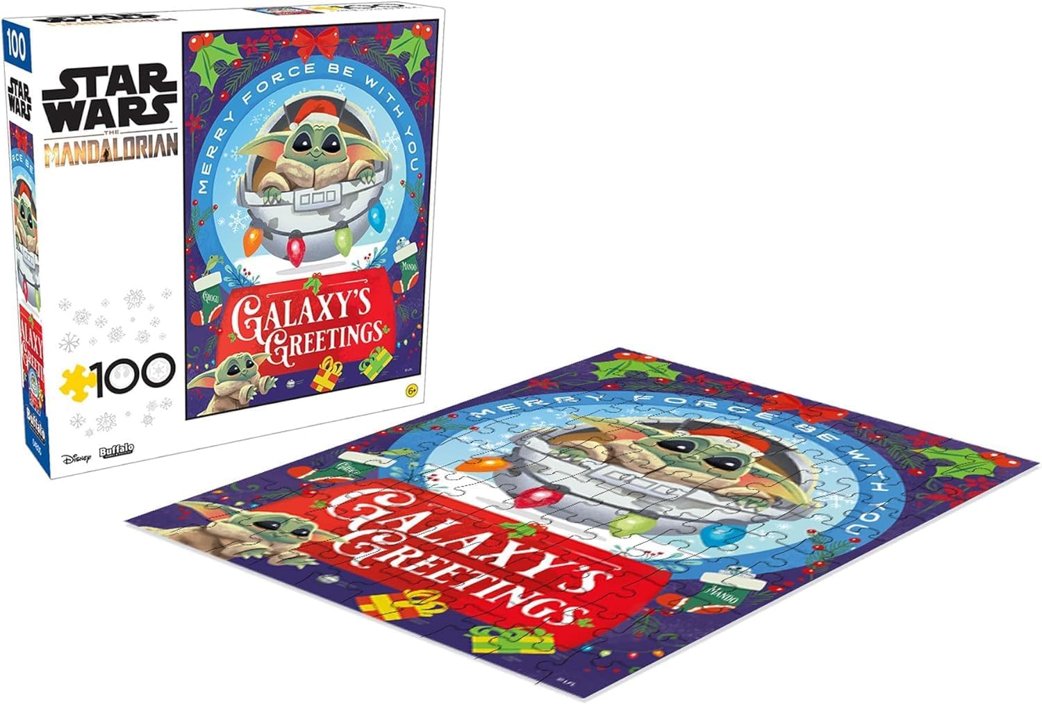 Galaxy’s Greetings is a 100-piece Star Wars™ jigsaw puzzle featuring artwork inspired by the series The Mandalorian™. “Merry Force be with you” reads the holiday tidings as you piece together this festive puzzle featuring Grogu™ wearing a Santa hat surrounded by holiday fun! Every Buffalo Games jigsaw puzzle is manufactured from recycled puzzle board. A precision cutting technique guarantees that every piece will fit soundly with the company's signature Perfect Snap™. A bonus puzzle poster is also included so that you have a handy reference of what the completed puzzle should look like while you put yours together. © & ™ Lucasfilm Ltd.
