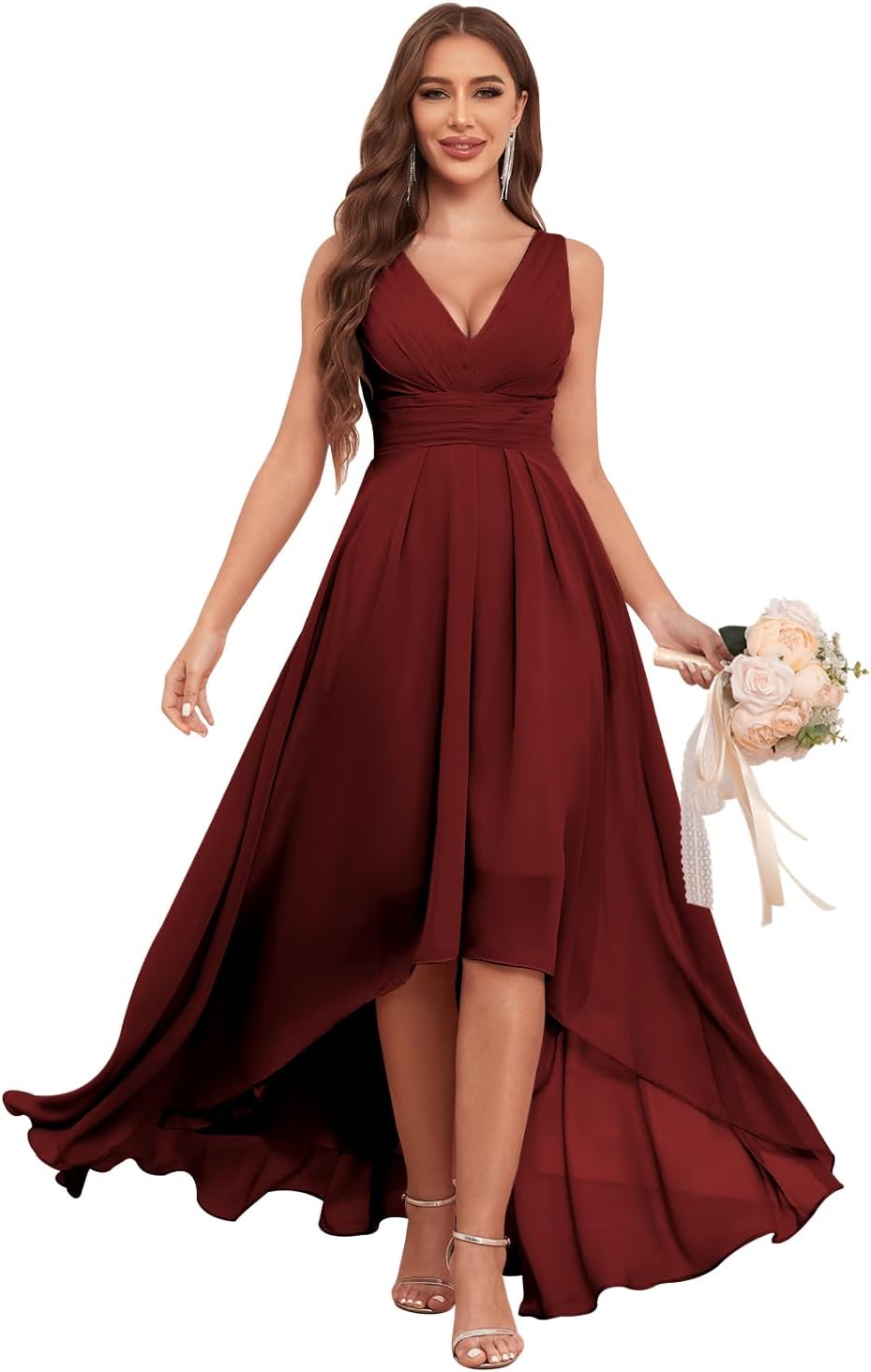 Fu Jiang High Low Bridesmaid Dresses for Wedding Long Pleated V-Neck Formal Evening Gowns with Pockets
