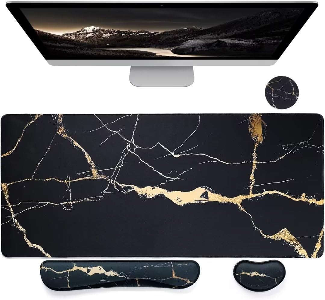 Bloss Ergonomic Mouse Pad and Keyboard Wrist Rest (4 Pcs), Non-Slip Desk Mat Protector, Desk Pad for Keyboard and Mouse, Large Gaming Mousepad-Black Marble (31.5×15.7 Inches)