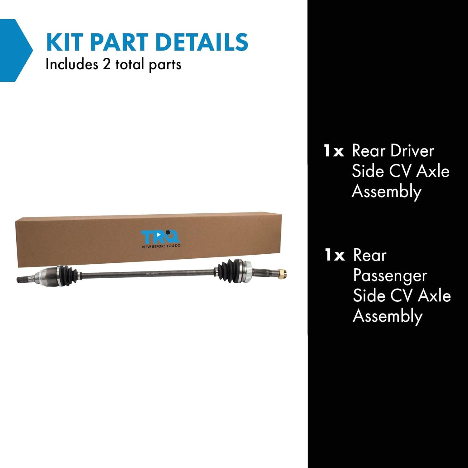 2 Piece CV Axle Assembly SetKit Includes(1) Rear Driver Side CV Axle Assembly(1) Rear Passenger Side CV Axle AssemblyFitmentCompatible with: 2016-17 Nissan Rogue All Wheel Drive Korea Built Models 1st VIN Digit K Rear Driver & Passenger SideCompatible with: 2018-19 Nissan Rogue All Wheel Drive Rear Driver & Passenger SideCompatible with: 2017 Nissan Rogue All Wheel Drive 1st Vin Digit 5 Rear Driver & Passenger SideCompatible with: 2015 Nissan Rogue All Wheel Drive From 11/01/14 Production Date Korea Built Models 1st VIN Digit K Rear Driver & Passenger SideCompatible with: 2017-19 Nissan Rogue Sport All Wheel Drive Rear Driver & Passenger SideProduct AttributesQuantity: 2 PieceProduct Features 100% New: Manufactured to tighter tolerances for extended service life Neoprene Boots: Improved durability compared to stock material Moly Greased: Specifically-designed grease shield to reduce premature wear Application Specific Design: No modificationItem DetailsTRQ CV (constant velocity) drive axles are manufactured using premium raw materials designed to restore original performance. TRQ CV drive axles are new, so there is no core charge with your TRQ purchase. TRQ-designed drive axles utilize neoprene boots, moly grease, stainless steel clamps, and heat-treated ball tracks to ensure extended service life. Each TRQ axle is application-specific so each spline and thread will mate properly for a seamless fit. All products are fit and road-tested in our Massachusetts R&D facility to ensure we deliver on our promise of Trusted Reliable Quality.Reference Numbers396001HC1C396004BA0A66-6442666442NCV53052NI-8466