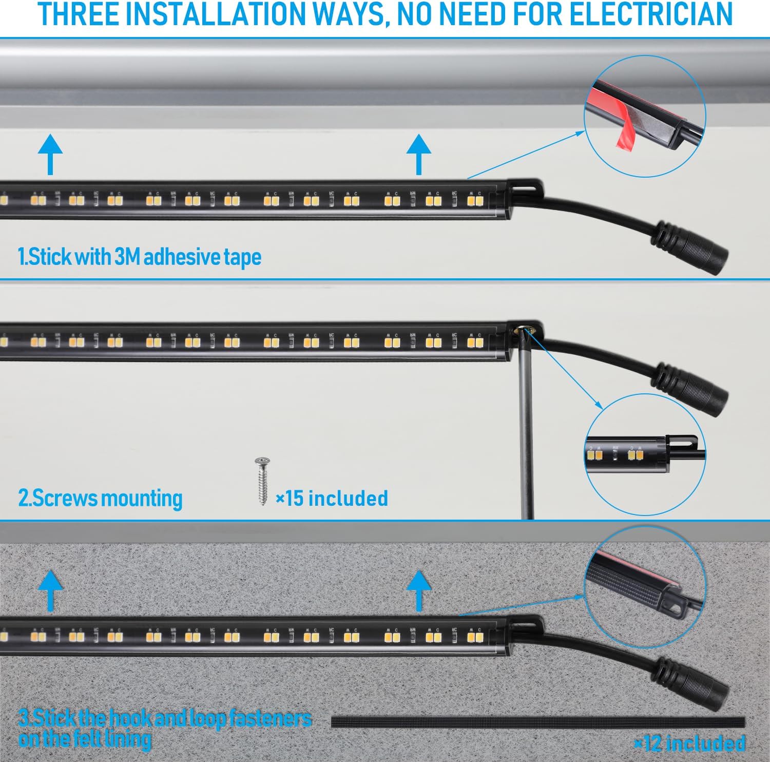 Easy Installation: The latest safes lighting kit offer three simple installation methods, screw fixation, direct adhesive using the included 3M tape on the light body, or attachment with the provided the hook and loop fasteners. It can be completed in minutes with common household tools