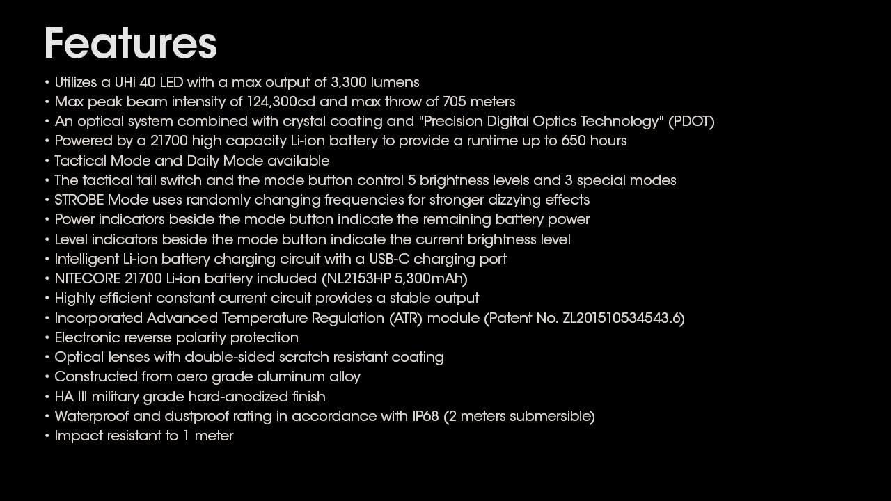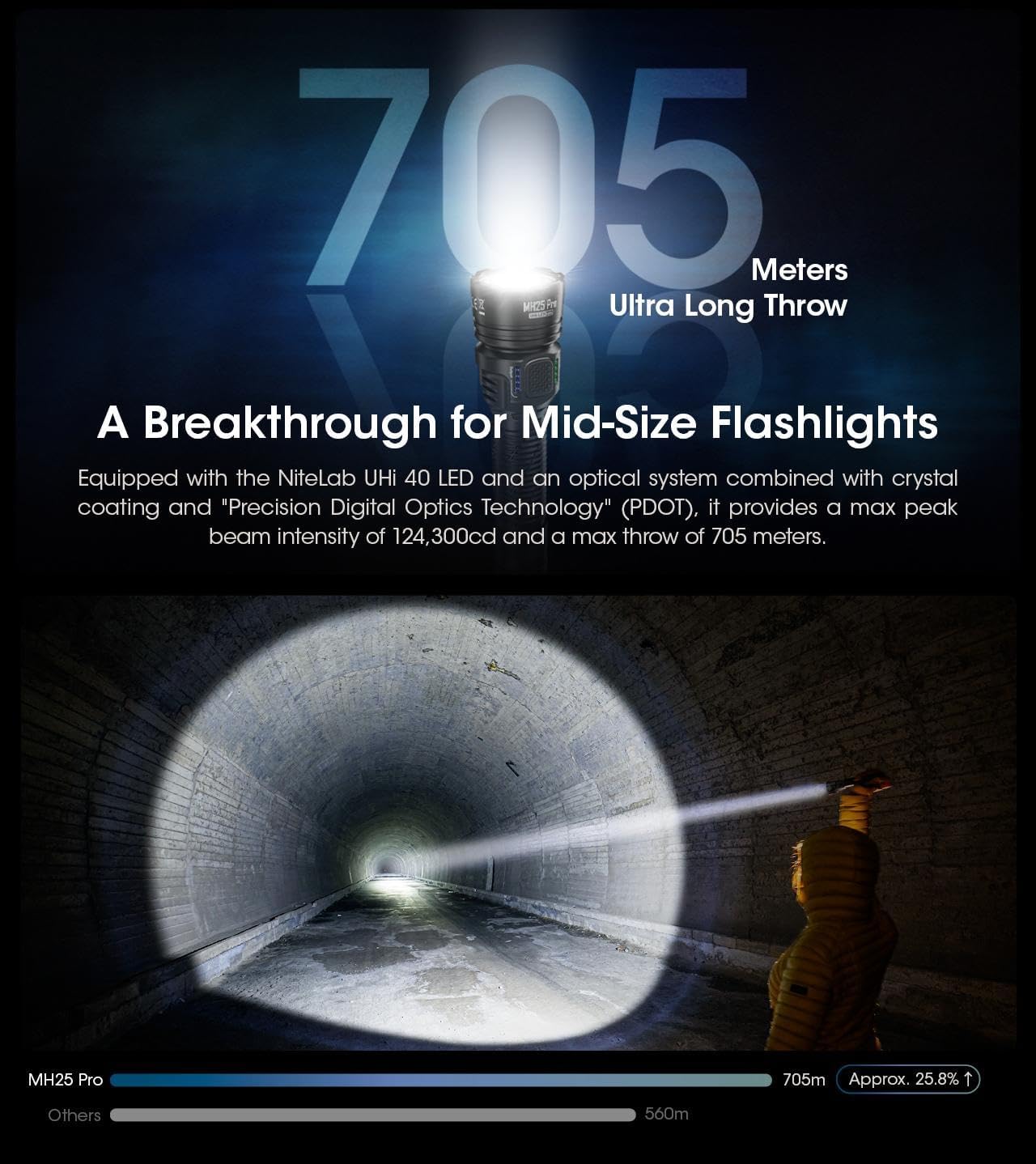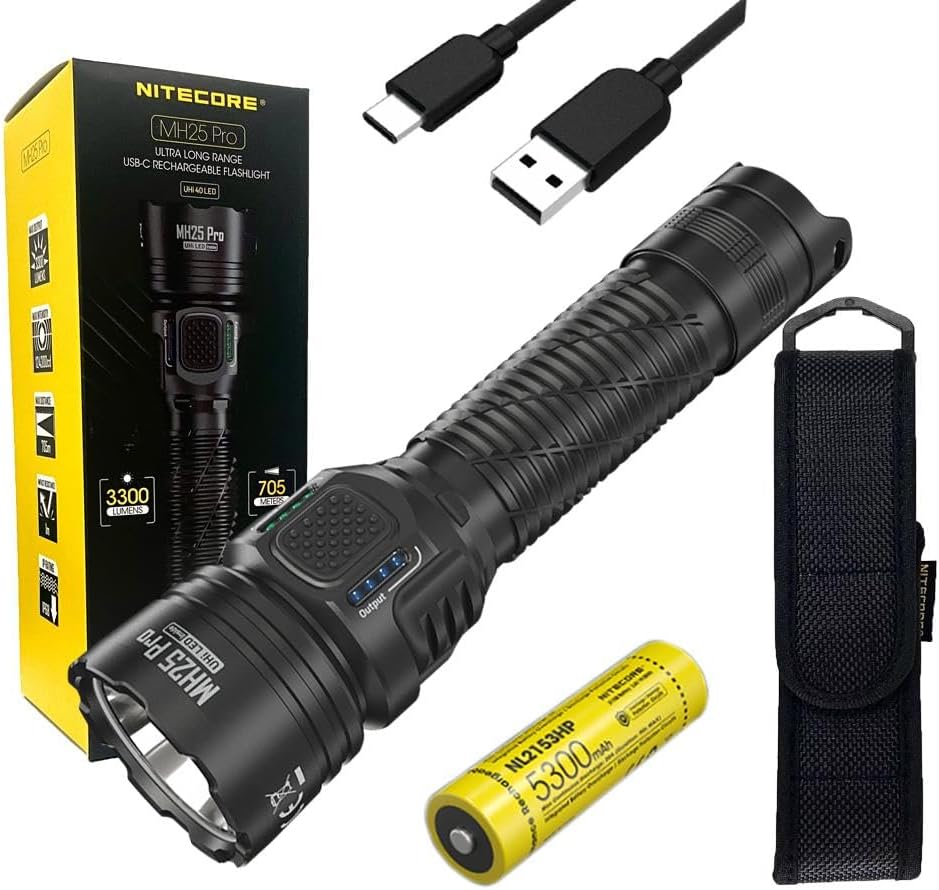 Linterna recargable Nitecore MH25 PRO de largo alcance - 3300 lúmenes, 705 m con cable recargable USB C Eco-Sensa