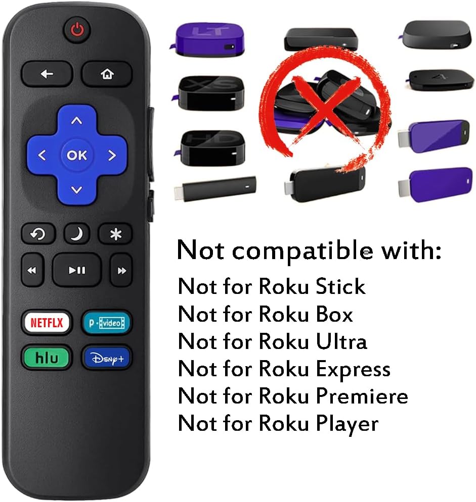 Compatible con --- El control remoto es compatible con todos los modelos de Roku TV, adecuado para TCL Roku TV, para Hisense Roku TV, para Onn Roku TV, para Sanyo Roku TV, para Philips Roku TV, para Insignia Roku TV, para JVC Roku TV, para RCA Roku TV, para Element Roku TV, para Magnavox Roku TV, para Westinghouse Roku TV, para Hitachi Roku TV, para LG Roku TV, para HaierRoku TV, para Sharp Roku TVs.