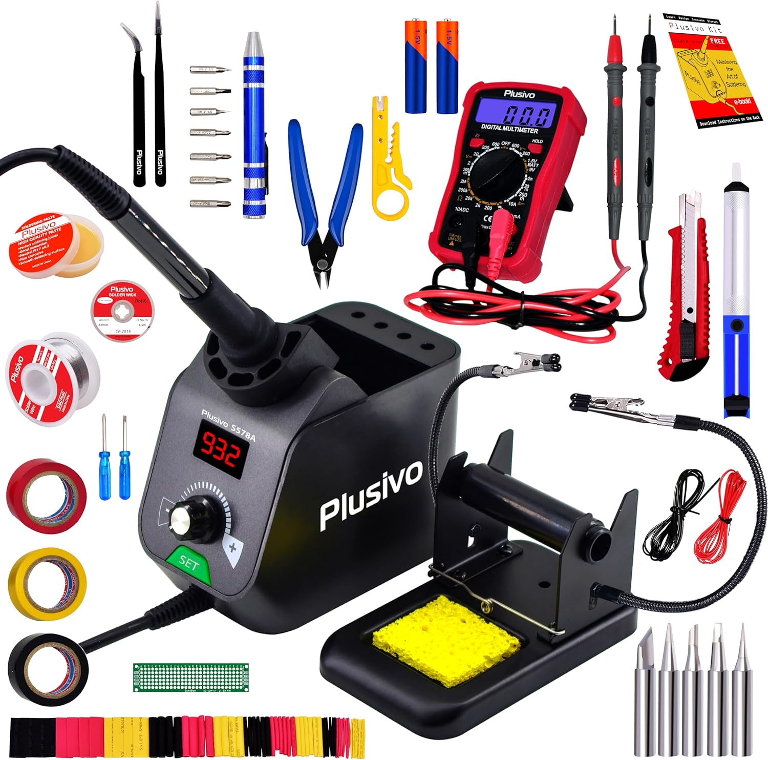 Soldering Iron Station Kit Digital Display Helping Hands 60 W 5 pcs Solder Tips, Solder Wire, Digital Multimeter °C/ºF Conversion, Standby/Sleep Mode, Calibration Support for Electricians from Plusivo