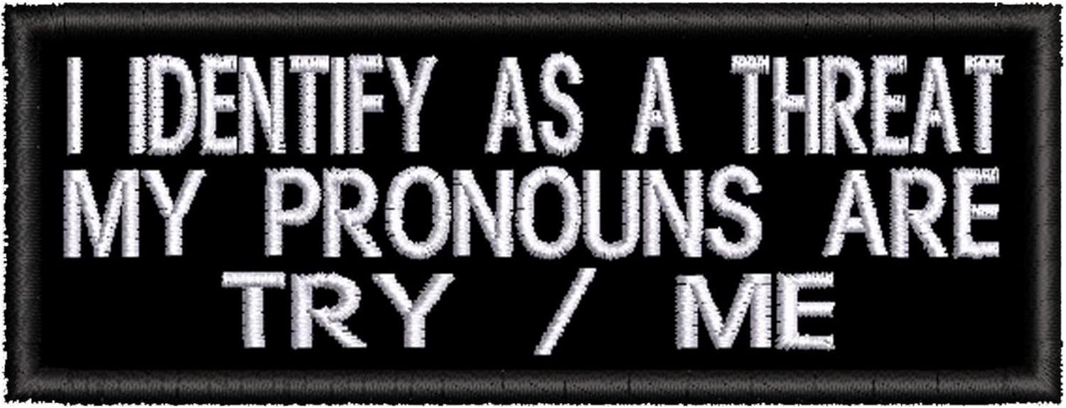 I Identify As A Threat My Pronouns Are Try Me Patch Iron-on Embroidered Applique for Clothing Vest, Sew-on Decorative Embroidery, Biker Badge Emblem, Sarcastic Funny Sayings, Motorcycle Jacket, Gothic