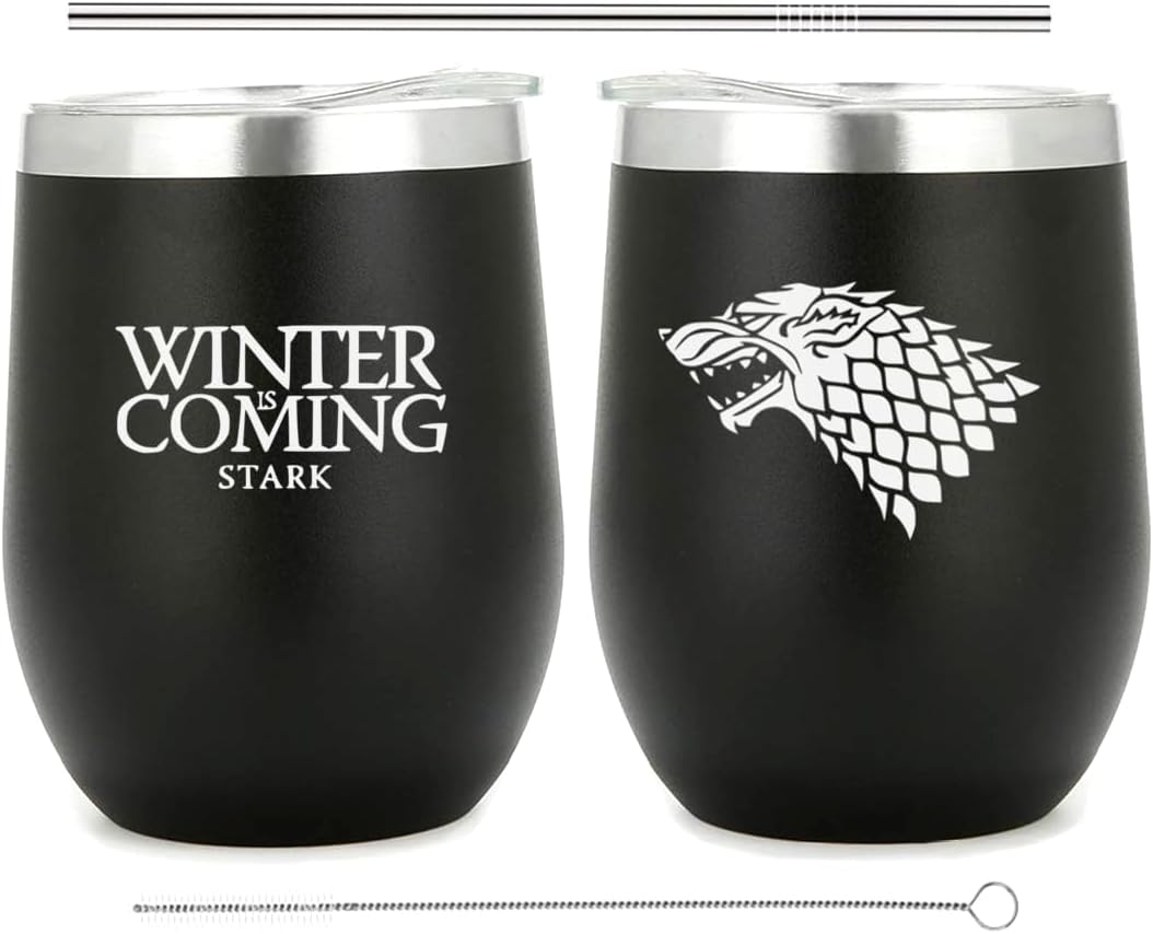 CSM Supply WINTER IS COMING - Thrones House Stark Black Stainless Steel Double Insulated Stemless 12oz Mug (1 MUG) - Metal Game Straw w Cleaning Brush Included