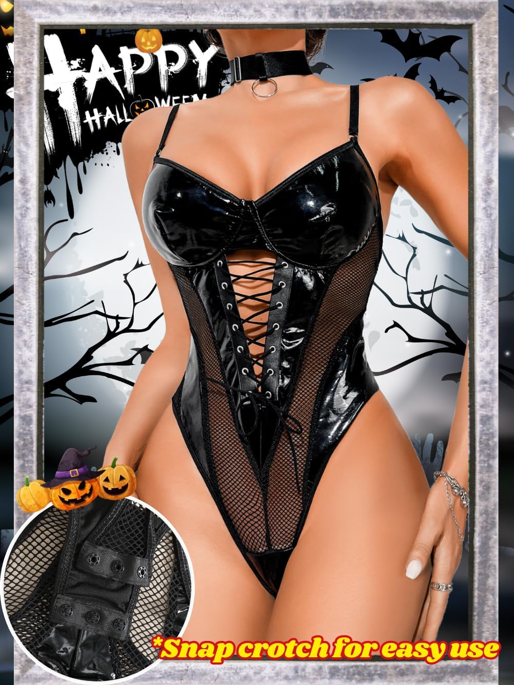 Kaei&Shi Rave Outfits Bodysuit Tops, Fishnet Corset Body Suit, Sexy Lingerie For Women, Faux Leather Festival Goth