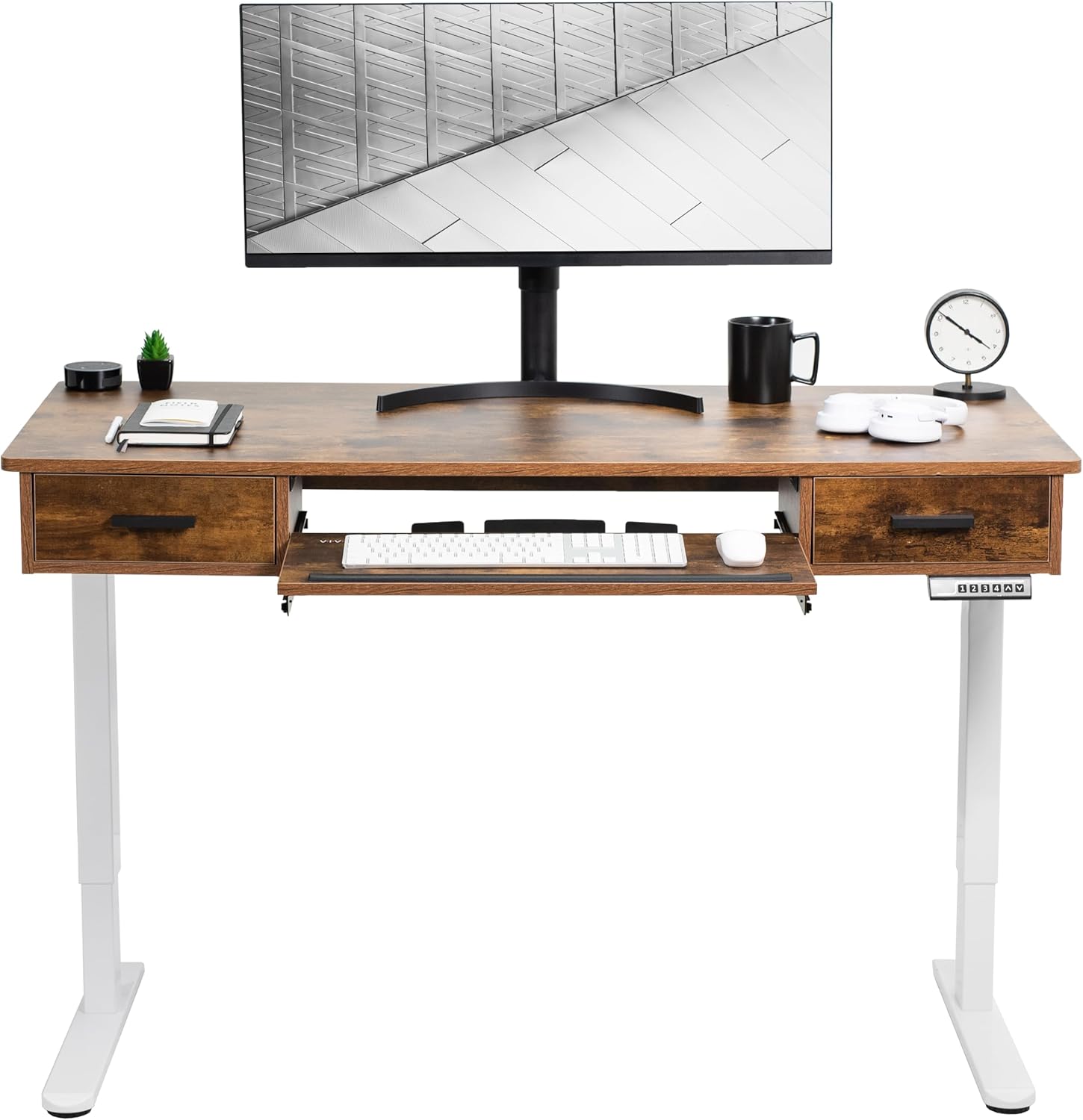 VIVO Electric Height Adjustable 55 x 24 inch Memory Stand Up Desk with Rear-Set Legs, Rustic Vintage Brown Table Top with Built-in Drawers and Keyboard Tray, White Frame, DESK-KIT-RW5MN
