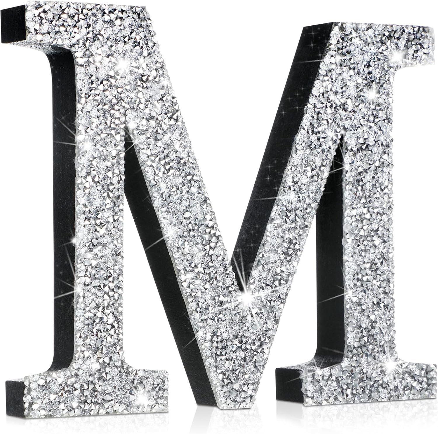 Qunclay Crystal Diamond Bling Letters Crushed Diamond Decorations Wooden Glitter Letters with Screw and Hooks Rhinestone Gifts for Christmas Wedding Bedroom Wall Decor(12''l X 12"w,Letter M,Silver)