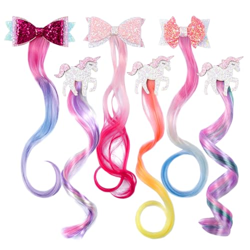 6 Pieces Unicorn Hair Clips for Girls, Bow Curly Rainbow Hair Extensions for Kids, Little Girl Hair Clips Accessories for Ponytails Princess Dress Up