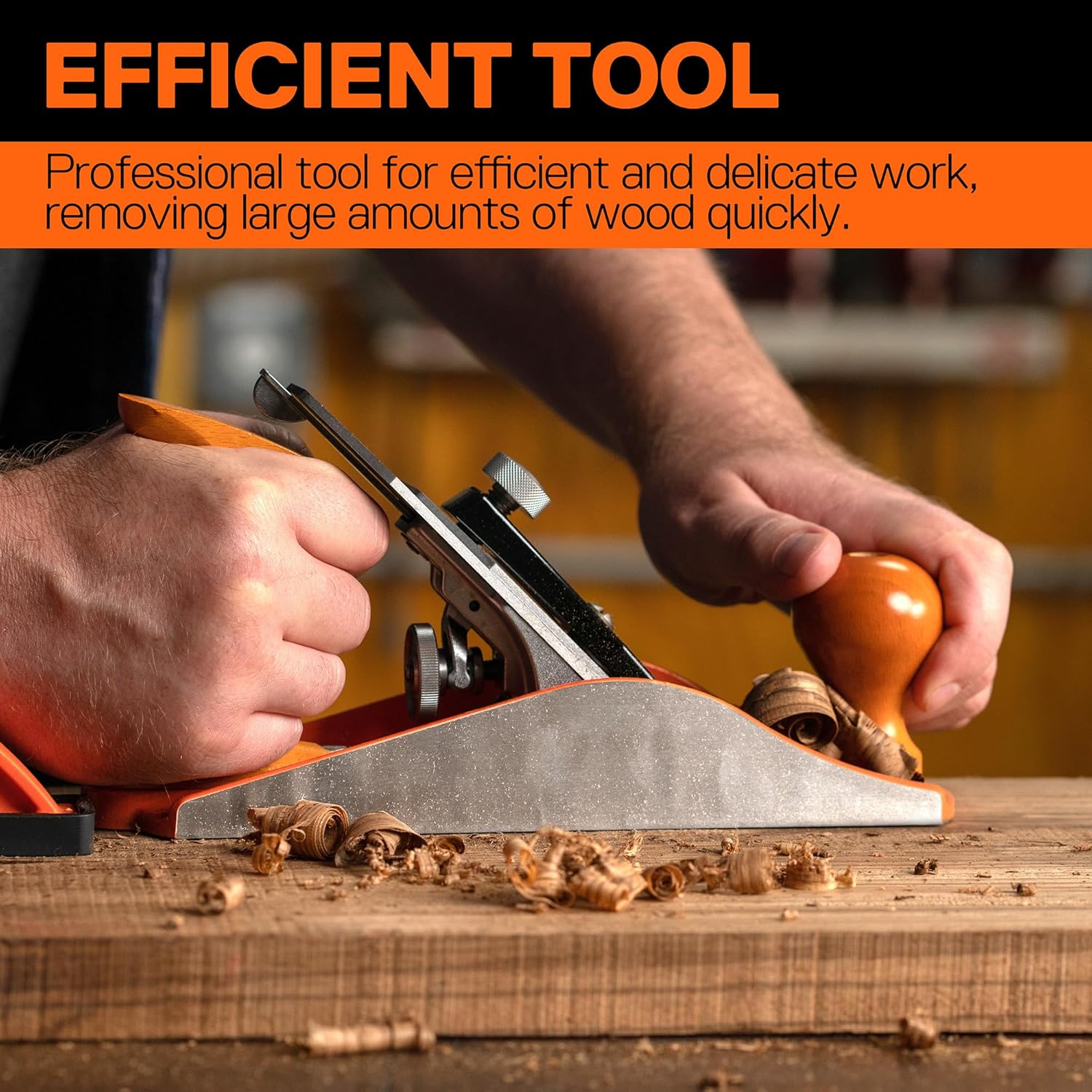 JORGENSEN No.4 10" Wood Planer: Ergonomic Handle & Flat Bottom. The handle is made of beech wood, high density and strength, strong resistance to stamping. After polished, the surface is smooth and burr-free, feels very comfortable in your hand. In addition, professionally and meticulously polished flat bottom provides smooth operation