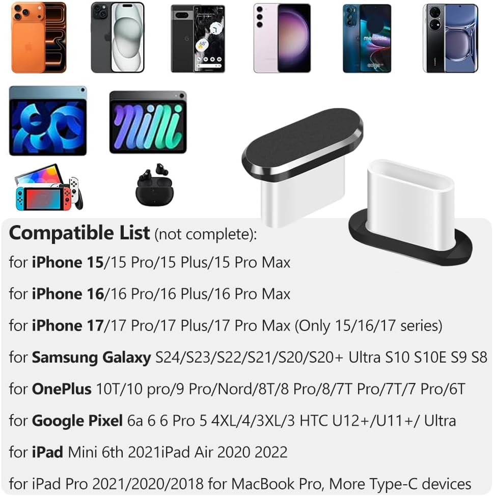 Wide Compatibility:USB Type c anti dust plug fit for all type c devices. Compatible with iPhone 17/16/15/15 Pro/15 Plus/15 Pro Max, Samsung Galaxy S22/S21/S20/S20+ Ultra S10 S10E S9 S8 Note 20 10 9 8, A51/A50/A12/A11, Moto Z/Z2, LG G5/G6/V20/V30 and other USB-C devices.