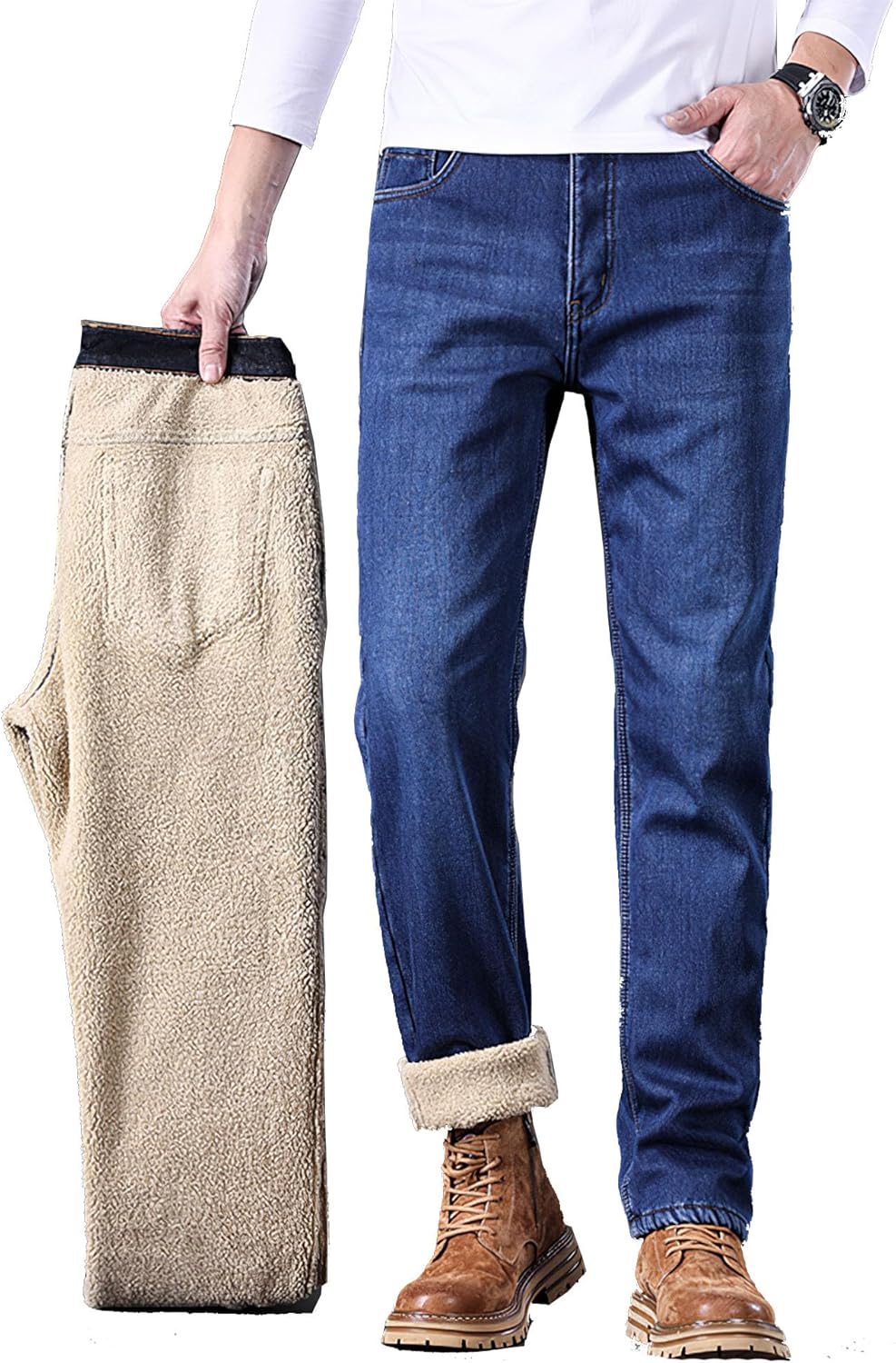 Mens Fleece Lined Jeans Straight Leg Stretch Winter Warm Denim Pants
