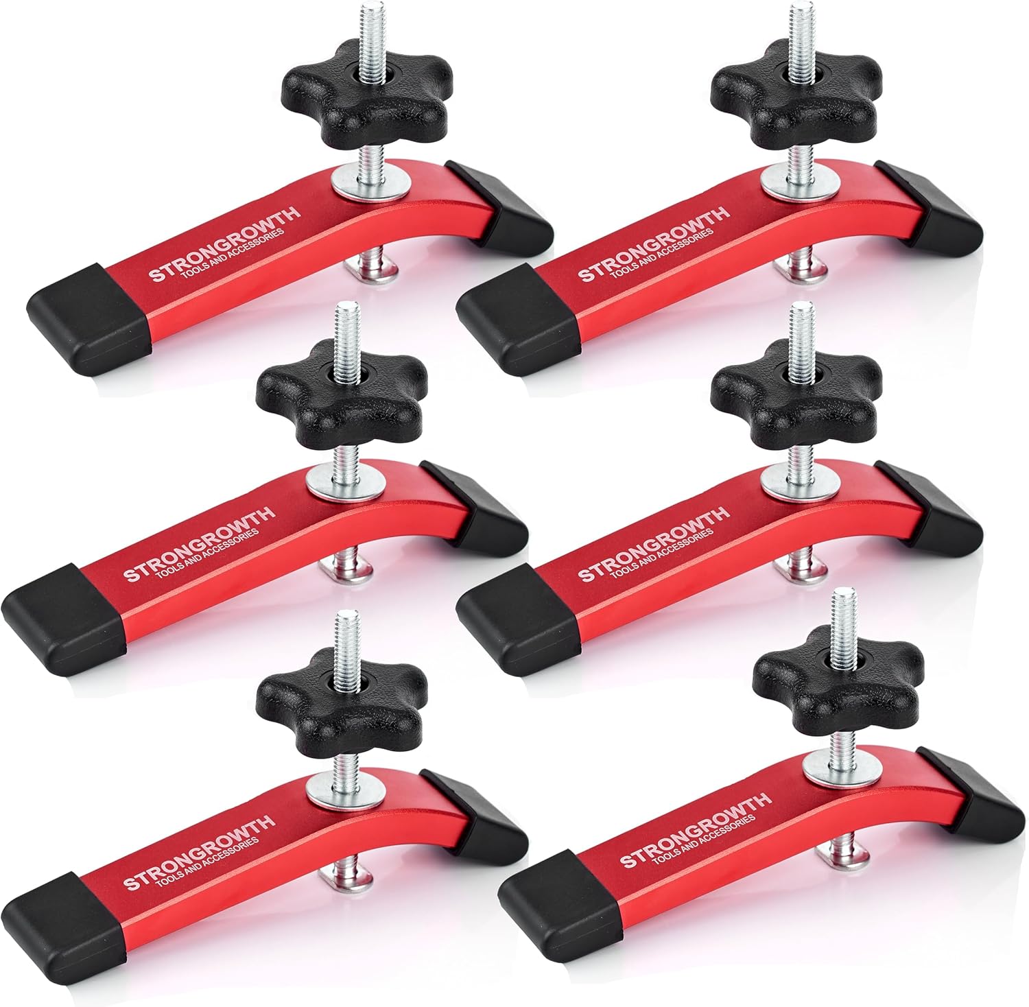 Wellcome to STRONGROWTH Direct shop! Specifications: Material: High-quality 6063 Aluminum Alloy Color: Red Length:6-3/8"L Width: 1-1/4"W Package Includes: 6pcs hold down clamps for T-tracks; 6pcs 5/16-Inch-18 thread 3-1/2-Inch long T bolts; 6pcs washers; 6pcs 5/16-Inch-18 thread 5-star knobsbr/> Noted T-Bolt: 3-1/2” L with 5/16”-18 Thread,Base size 101/128” L x 33/64” W x 11/128” thickness. Here you can find a good t track clamps for woodworking, for jigs and also. Various length t tracks you can choices, such as 24”,36”,48”,3” intersection kit. STRONGROWTH t-tracks were unique double-cut and Standard universal smooth internal groove. So it make you can easily building and customize your ideal workbench, expand and optimize your work configuration, machine tables, jigs and fixtures. STRONGROWTH t slot tracks / tee track intersection kit and hold down clamps is very easy to install by screws, t bolts or knobs. So let us use the Strongrowth aluminum t track woodworking Make a wonderful life, let go!