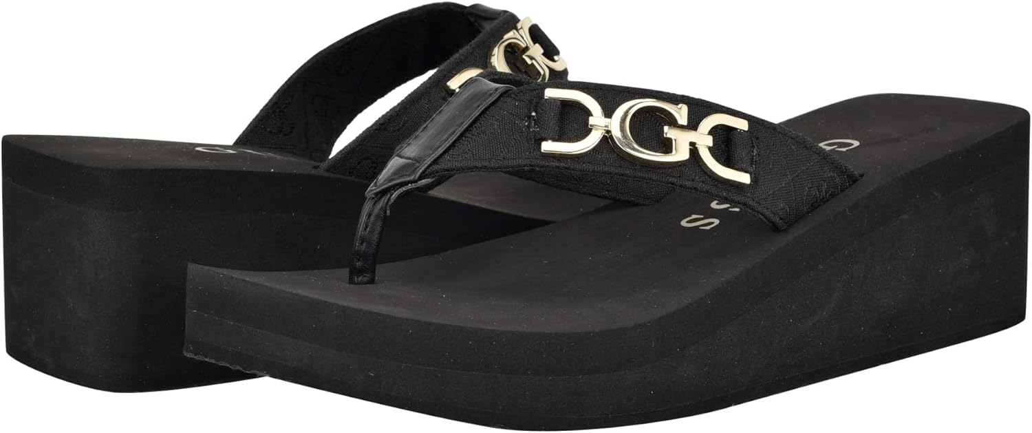 From the beach to the boardwalk, the GUESS Edany wedged flip flop features a comfortable foam platform. Featuring the G chain logo detail on the fabric toe thong adds a little shimmer to your summer.