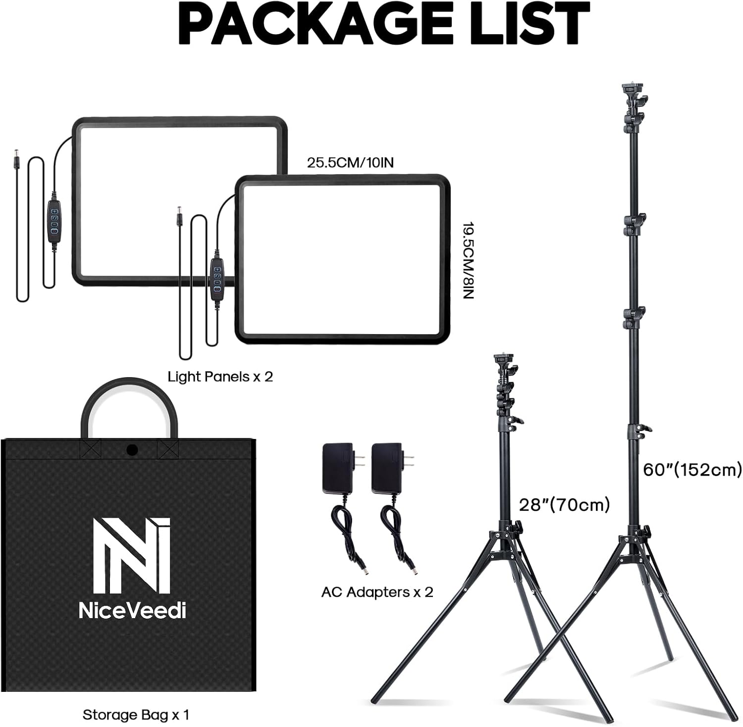 【Lista de paquetes y servicio al cliente】Habrá 2 paneles de luz de estudio LED con cable. soporte de trípode ajustable para cada panel de luz, 1 manual de usuario, 1 bolsa de almacenamiento, 2 adaptadores de CA. Cualquier problema que encuentres durante el uso o cualquier defecto que surja, ten la seguridad de que estamos aquí para asistirte.