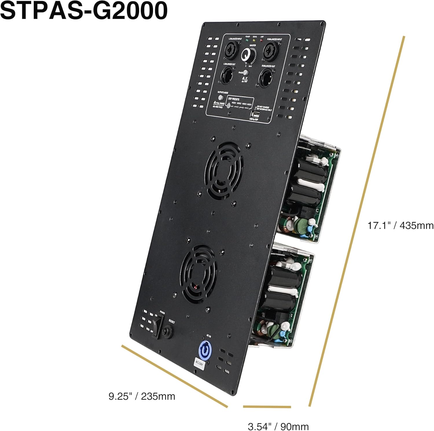 SOUND TOWN STPAS-G2000 PLATE AMP: Capable of 800W continuous (8Ω) per channel, the STPAS-G2000 2-channel class-D plate power amplifier offers exceptional audio output for various applications