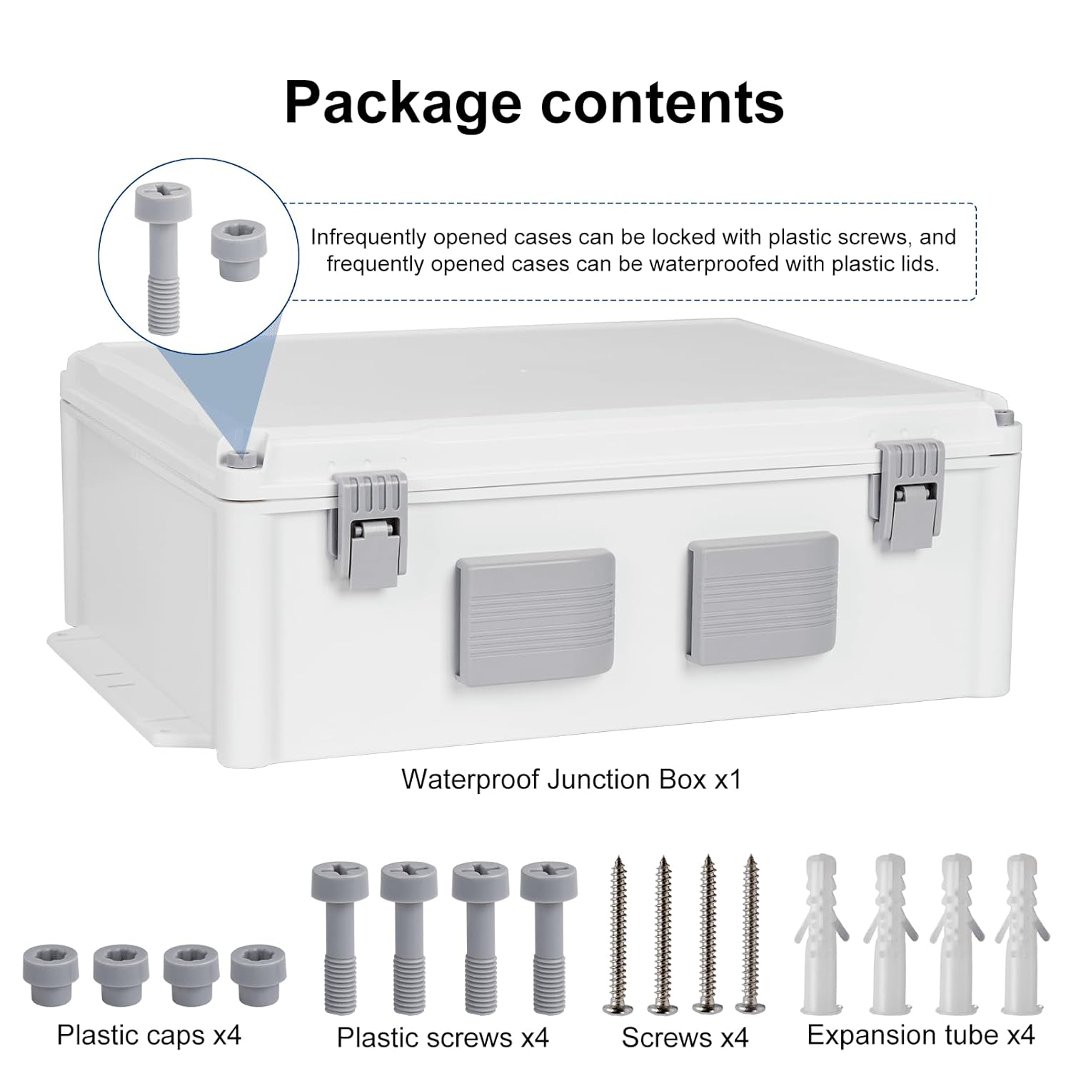 【Easy to install】The waterproof box comes with a removable grill mounting plate, so you can easily install the equipment in the waterproof plastic box. Equipped with mounting screws, the outdoor electrical box can be hung on the wall or fence.
