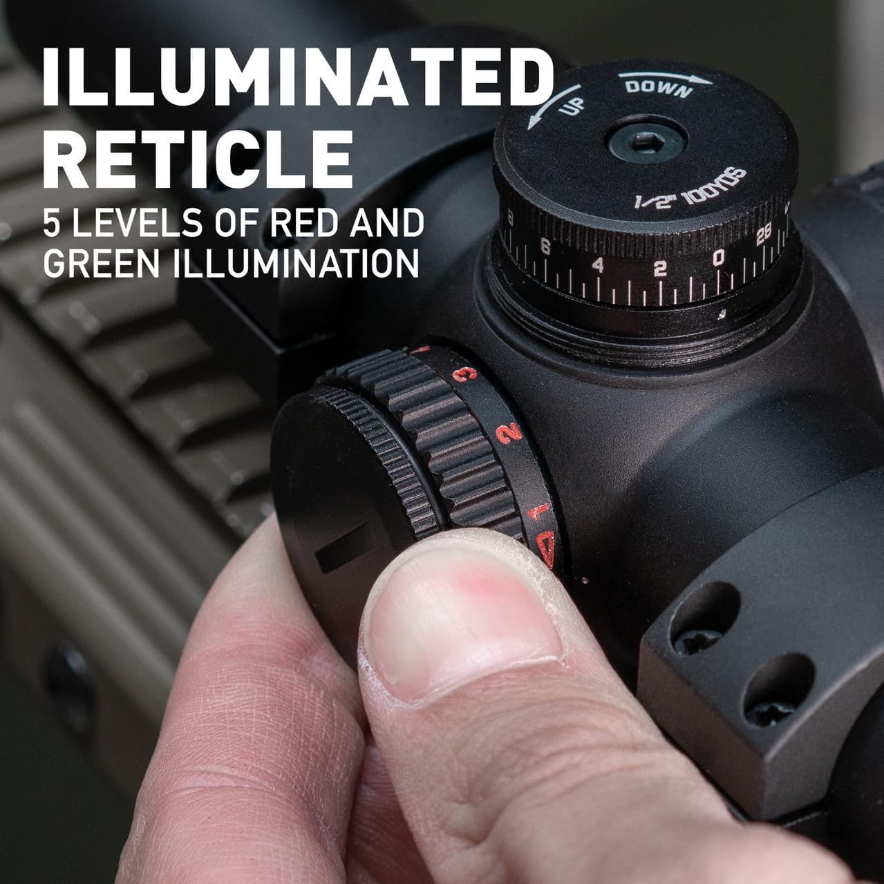 Available in two different second focal plane reticle designs: the BDC B1 reticle with 5.56 BDC hashmarks or the MX1 box reticle. Second focal plane reticles remain the same size at all magnification levels for high visibility at all magnifications.