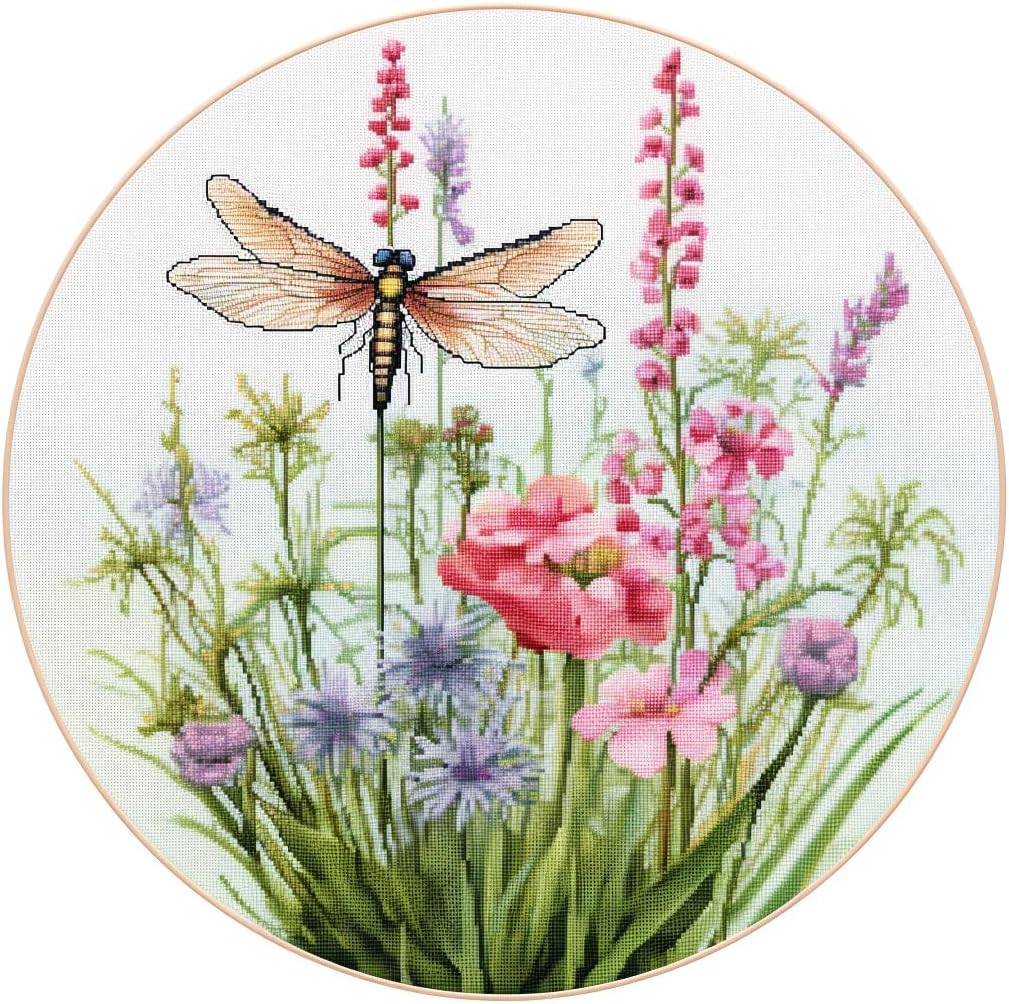 Dragonfly and Wild Flowers Stamped Cross Stitch Kits for Beginners Easy 11CT Needlepoint DIY Embroidery Counted Cross Stitch Kits Art Craft Wall Decoration and Gift 40x40cm(1)