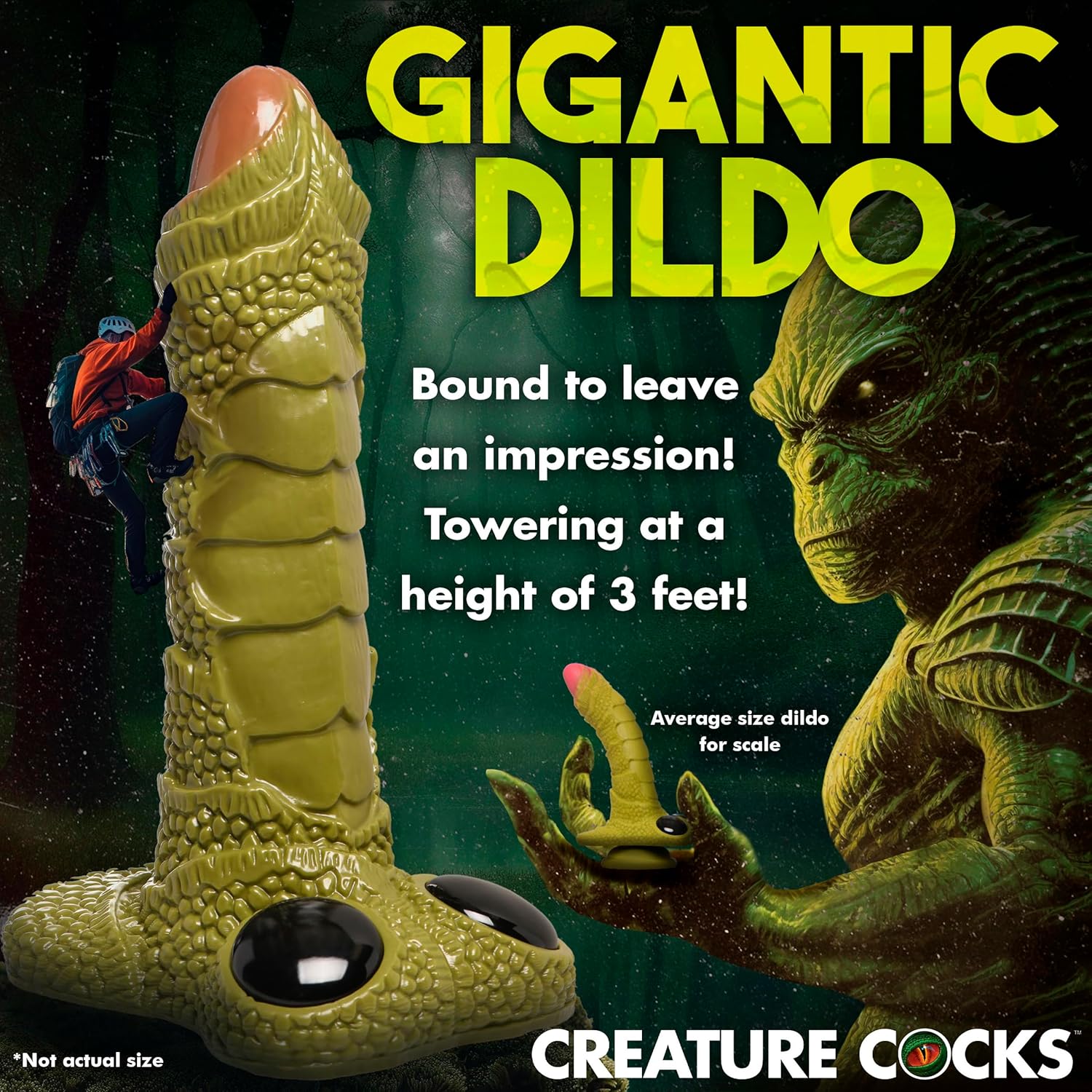 GIANT FANTASY DONG: This giant, 3 foot tall and 84 lb monster dildo is green, peach and has a unique scaly texture. Two eyes gaze up from the base. Inspired by a swamp beast, this rod is one of the biggest out there!